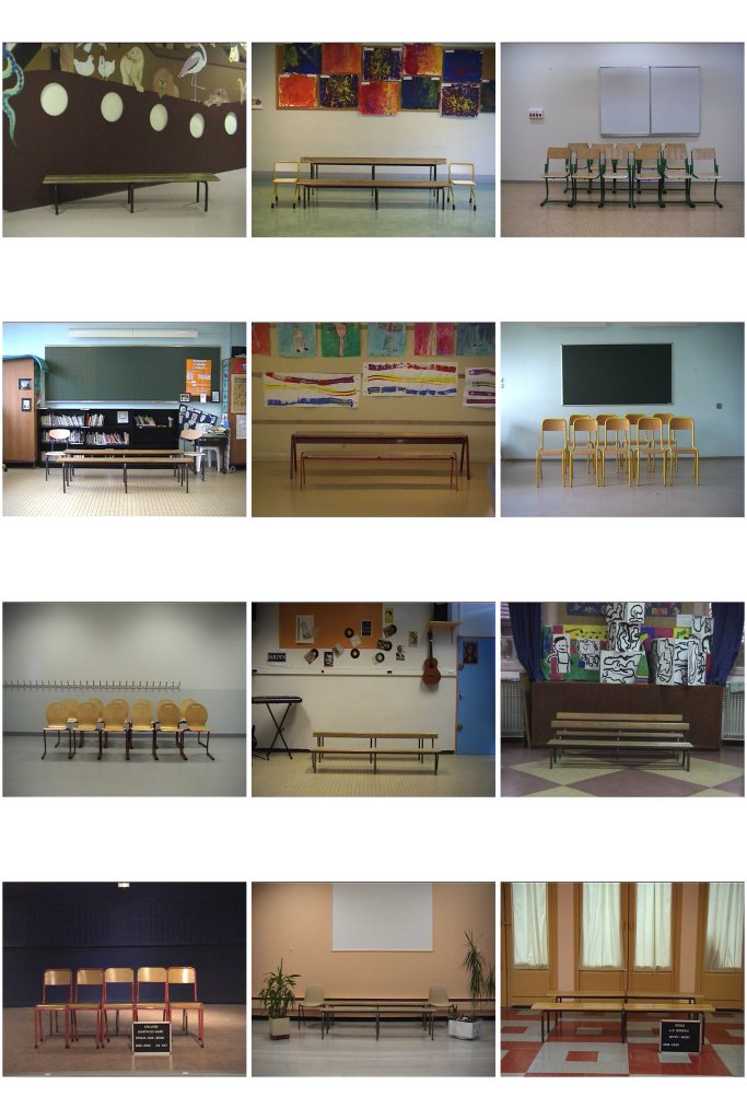 Ainsi, ce ne sont plus les maquillages, les postures et les habits chaque fois différents– ce que Erving Goffman (dans La mise en scène de la vie quotidienne) nomme la « façade personnelle13 » pour qualifier tous ces éléments plus ou moins mobiles qui se confondent avec la personne de l’acteur – qui permettent à l’artiste d’incarner des personnages aux identités multiples – comme a pu s’y essayer Claude Cahun dans ses autoportraits – mais bien plutôt ici, par un jeu de travestissements renversés, où ce sont les décors d’arrière-plan de la scène – « les éléments scéniques de l’appareillage symbolique14 » pour reprendre les termes du sociologue –qui, citant chaque jour des motifs différents de l’école, façonnent grandement les comportements du photographe professionnel et troublent alors l’identité de mon personnage de fiction. Mais, quelle que soit l’identité sous laquelle j’opérais (définie en fonction du rôle social ou subjectif à jouer), dans les deux cas j’essayais d’apprivoiser petit à petit l’étrange familiarité de mon contexte d’évolution. Étrange, puisque sur le territoire de l’Autre, je n’aurais jamais le temps de me familiariser complètement avec les nouvelles toiles de fond qui ne cessent de changer en fonction des établissements scolaires visités, mais familiers, car le dispositif de mise en scène et le cadrage restaient toujours quasiment les mêmes. Cet écart formalisait par l’inadaptation de l’acteur à ses décors, étant alors sensé permettre de marquer l’influence du cadre de travail sur le modelage des identités tout en démontrant l’inadéquation de la subjectivité débordante des employés à leur environnement de travail.