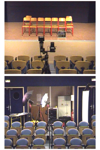 J’ai donc commencé à utiliser à la fois mon contexte de travail comme décor, le matériel disponible (trépieds, flashs, réflecteurs, etc.) et le temps que j’arrivais à soustraire à mon temps de travail pour développer une pratique parallèle commandée par mes études d’arts plastiques. Afin de ne pas être complètement exclu des règles du jeu universitaire, je cherchais à faire de mes contraintes routinières au travail le moyen de développer une pratique artistique. À l’aide d’une petite caméra vidéo personnelle et de tout le matériel auquel j’avais accès sur place, j’ai amorcé la réalisation d’une série d’autoportraits. Je me servais du dispositif de prise de vue disponible pour me représenter en train de jouer avec les décors vides et dans le cadre normalement dévolu aux élèves.