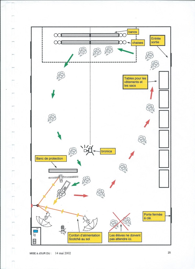 Je devais être très tôt le matin dans l’établissement pour installer mon matériel (fourni par l’entreprise) et être prêt à commencer les prises de vues avec les élèves à huit heures du matin (arrivé à l’aube, la plupart du temps, c’est le concierge qui m’ouvrait la porte de l’établissement encore vide). En moyenne, je travaillais sur un établissement par jour, ce qui représentait entre quatre cents et huit cents individus à photographier. Lorsque les établissements étaient plus grands, je prenais alors deux jours pour faire toutes les prises de vues et pour ceux qui étaient plus petits, il pouvait m’arriver d’en faire deux dans la même journée (les plannings de travail étaient réalisés au fur et à mesure et délivrés au dernier moment). Chaque soir, une fois mon travail accompli, je devais placer les films exposés (aux formats 135 et 120, c’est-à-dire 24×36 ou 4,5×6) dans une enveloppe et les envoyer au laboratoire-usine de photographie (également propriété du groupe Fotovista ).