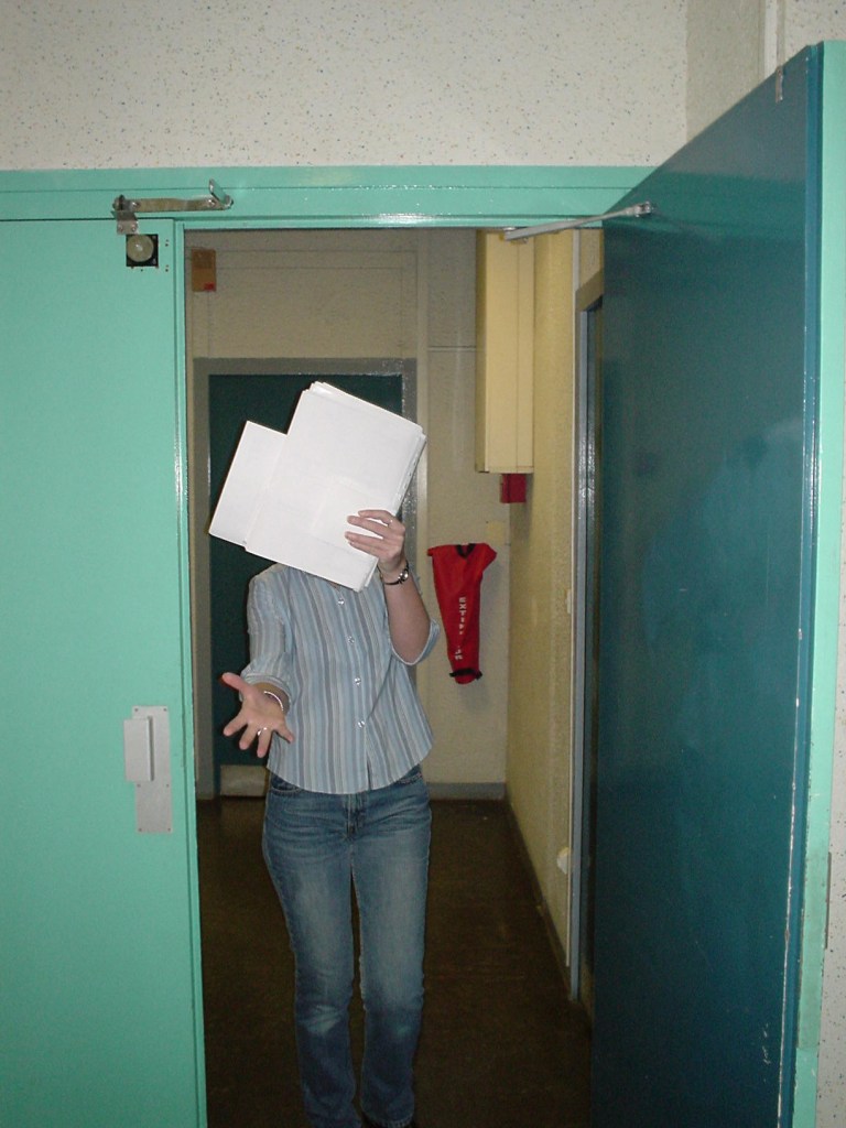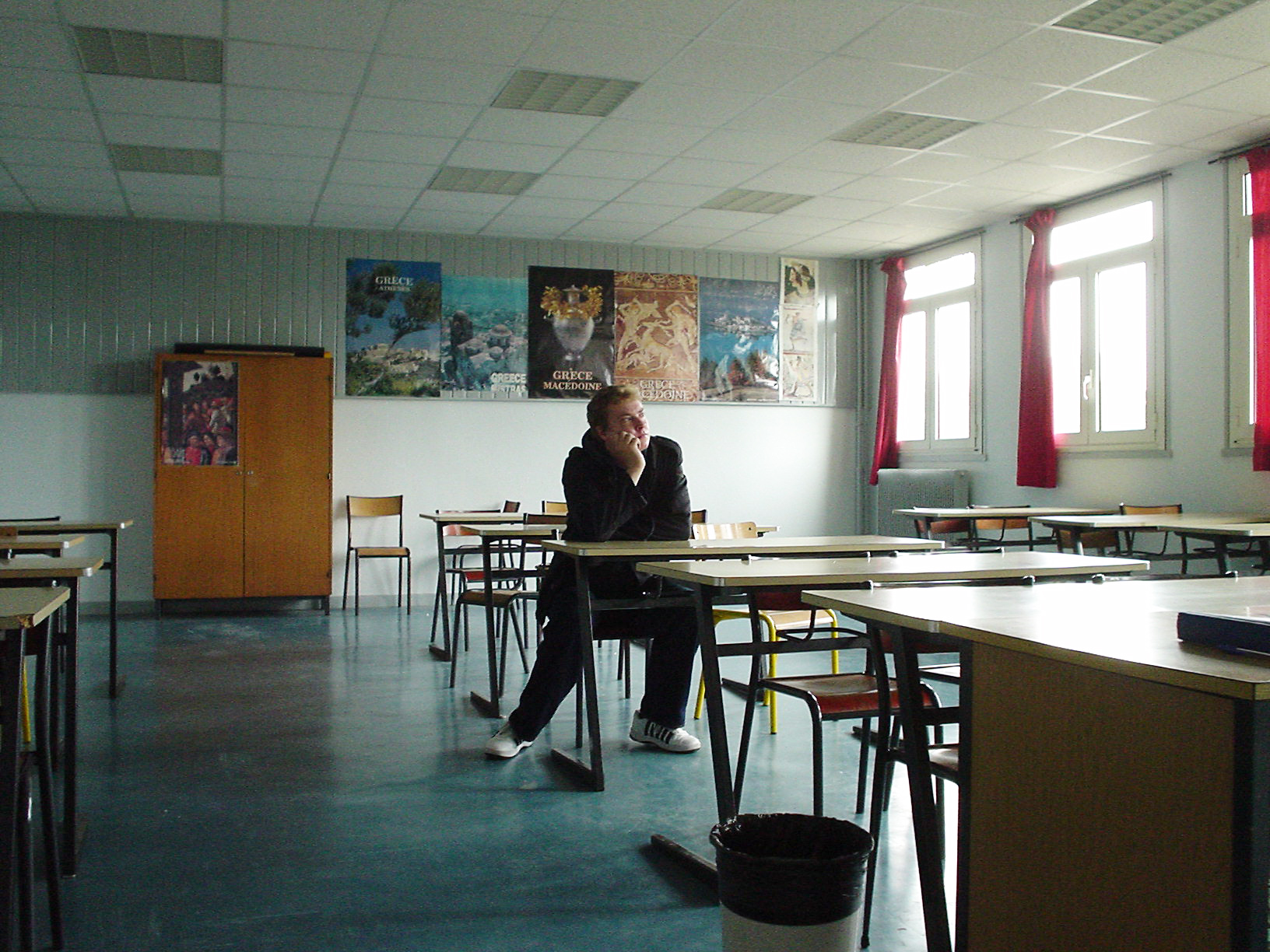 Dans cette série d’autoportraits réalisée en juin 2004 (c’est-à-dire lors des derniers jours de l’année scolaire et de mon contrat de travail), j’ai pris autant de pauses qu’il a fallu prendre la pose dans les différentes classes vides du collège. Les postures que j’adopte oscillent entre ennui, solitude, et rêverie. Je cherche une posture entre celle d’un collégien, d’un surveillant et d’un enseignant. Je me place successivement du côté de l’autorité et de l’adulte en surveillant debout sur le devant de la scène, en enseignant assis derrière le bureau du professeur puis du côté de l’élève surveillé et enseigné dans la salle de classe assis derrière une table de collégiens. Tantôt étudiant à l’université et tantôt travailleur de l’éducation nationale, dans les deux cas je joue un rôle et m’amuse à jeter le trouble sur mes identités au travail. Ni étudiant, ni enseignant, ni travailleur, ni chercheur, ni artiste… ou un peu tout ça à la fois, j’avance petit à petit vers la revendication d’une identité en « travailleur polymorphe2 » qui fait de chaque nouveau contexte de travail l’enjeu de détournements, de documentations et de représentations.