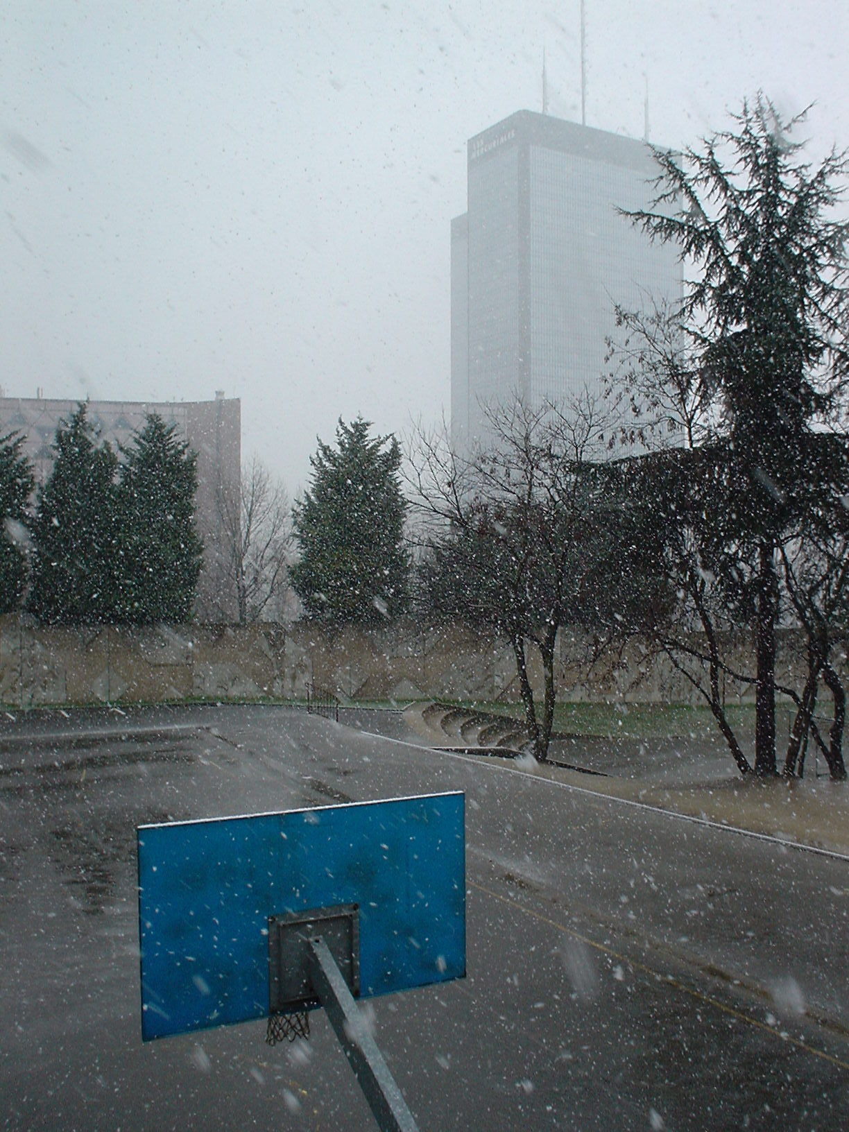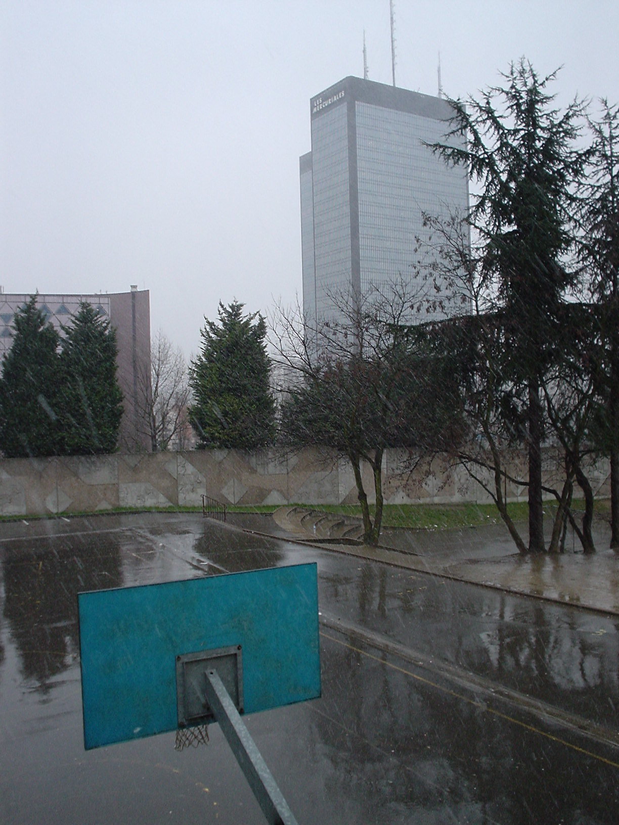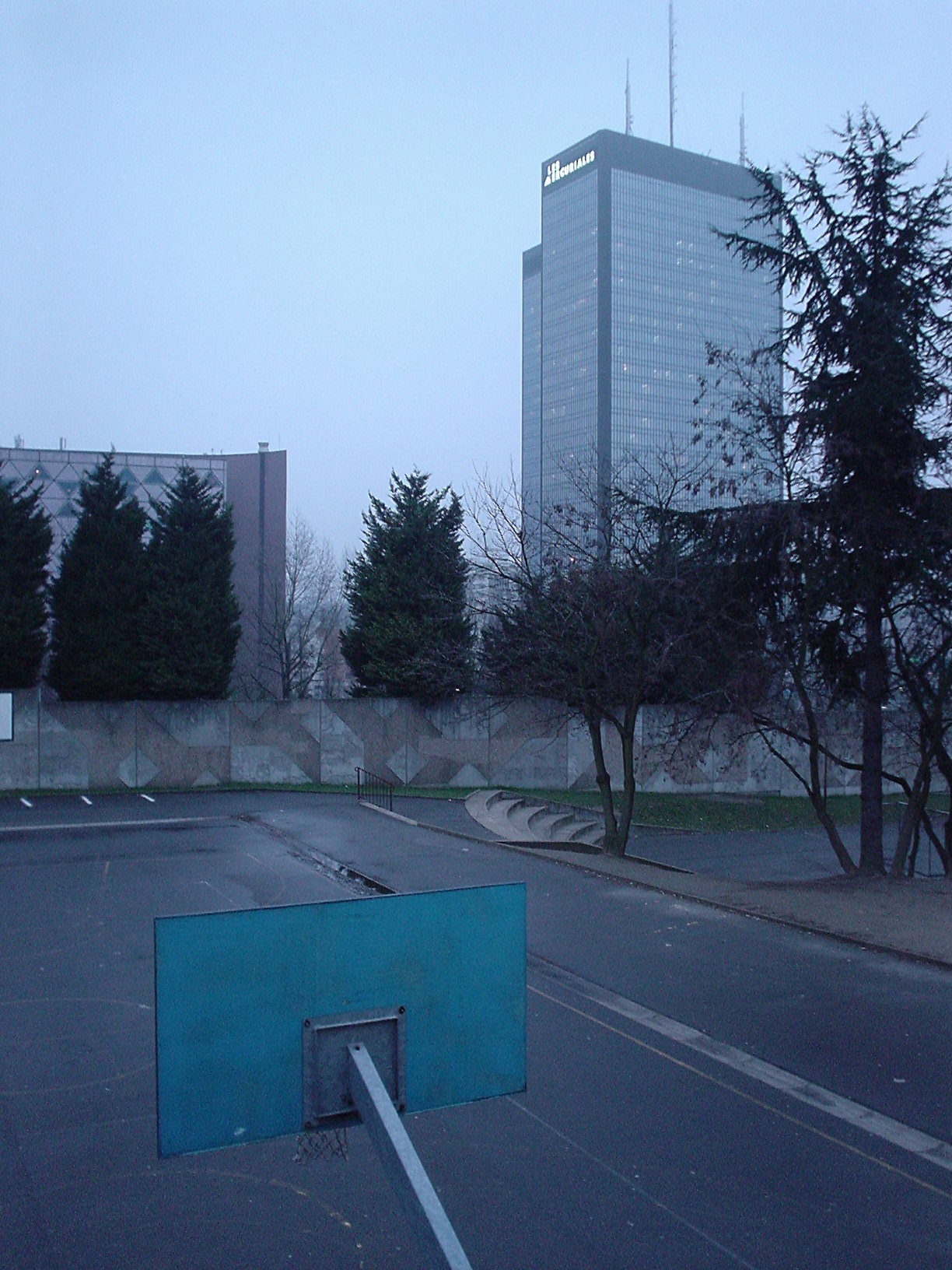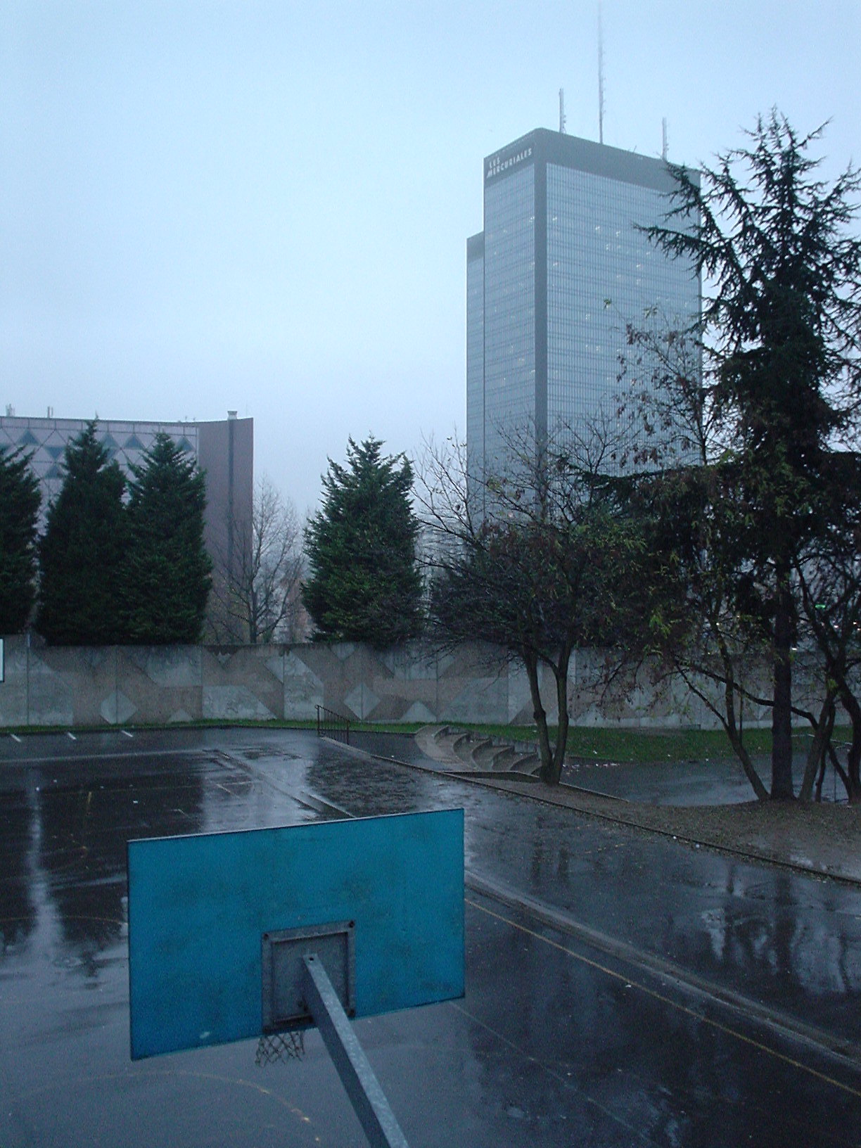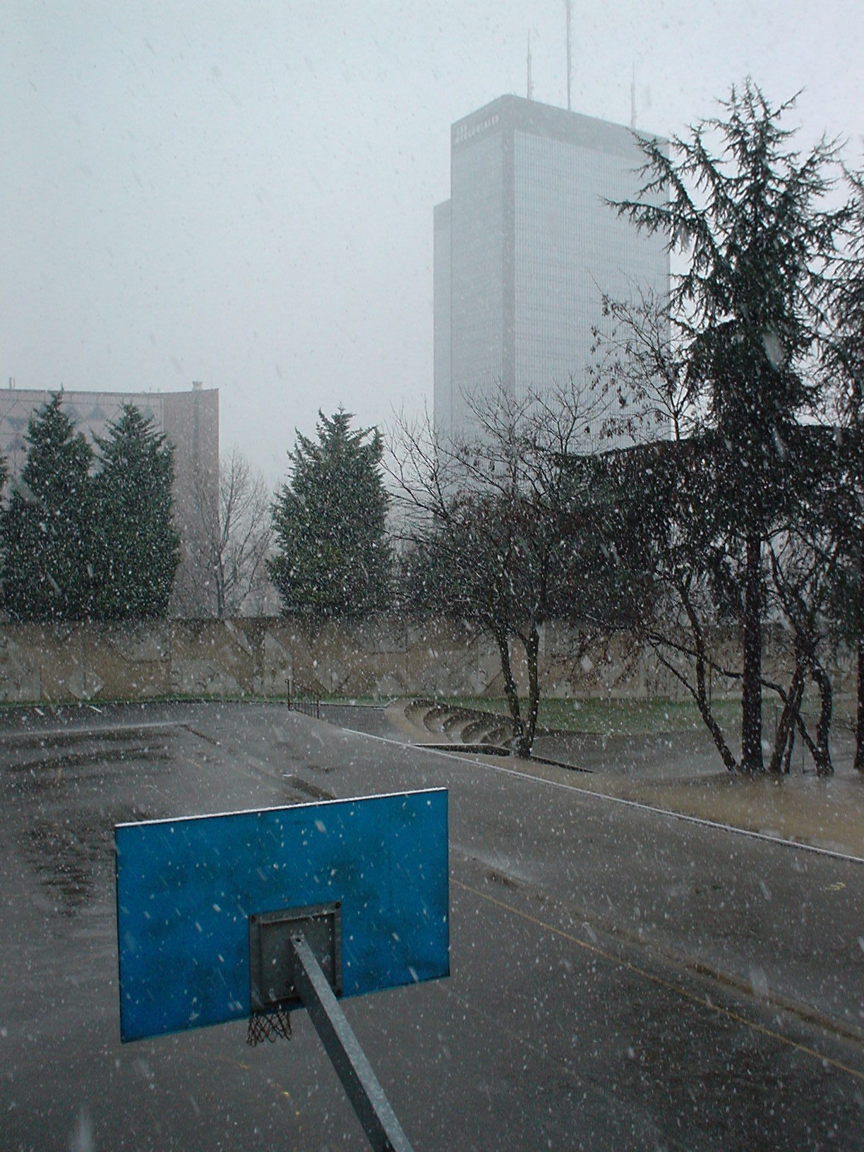 Une tentative d’épuisement du paysage routinier à partir du point de vue que l’on obtient depuis la salle fumeurs des enseignants. Chaque photographie est donc le résultat d’une pause (clope) prise sur le travail. Les prises de vue sont réalisées de façon quotidienne et s’étendent sur l’année de septembre 2003 à juin 2004. Le cadrage est toujours le même et l’écoulement du temps au collège sur une année est rendu prégnant à l’image par le changement des saisons. Le temps s’imprime à l’image, les variations de lumière d’une prise de vue à l’autre et les fondus enchaînés évoquent les jours qui passent. Une année entière est ainsi condensée à l’image.