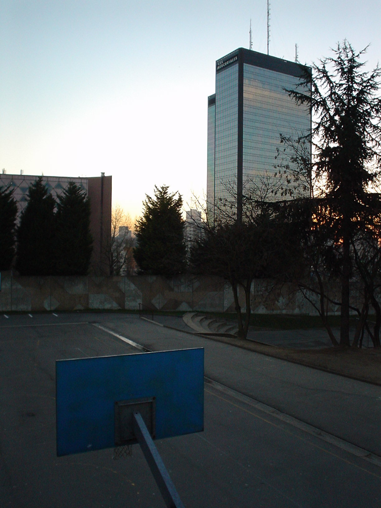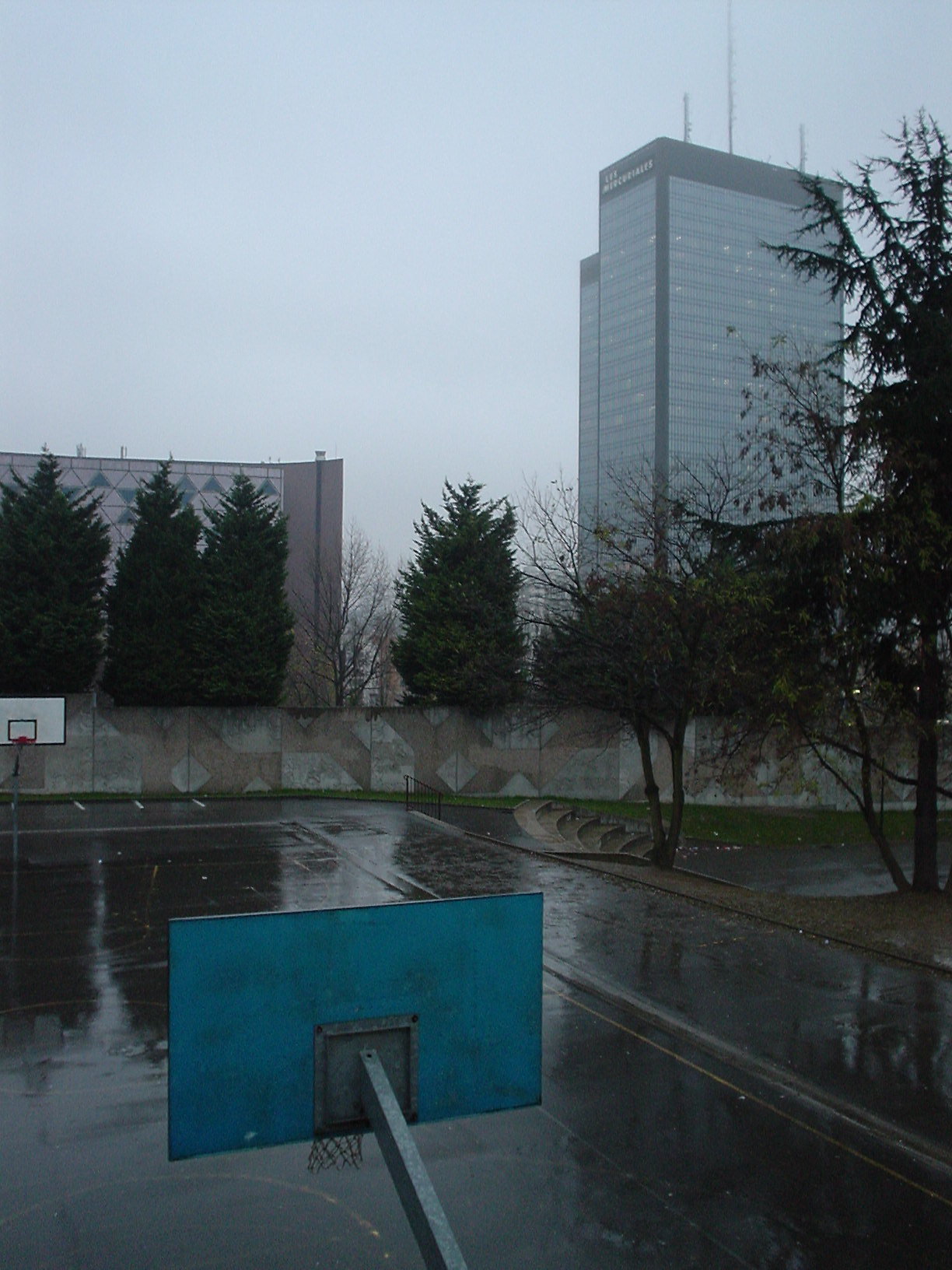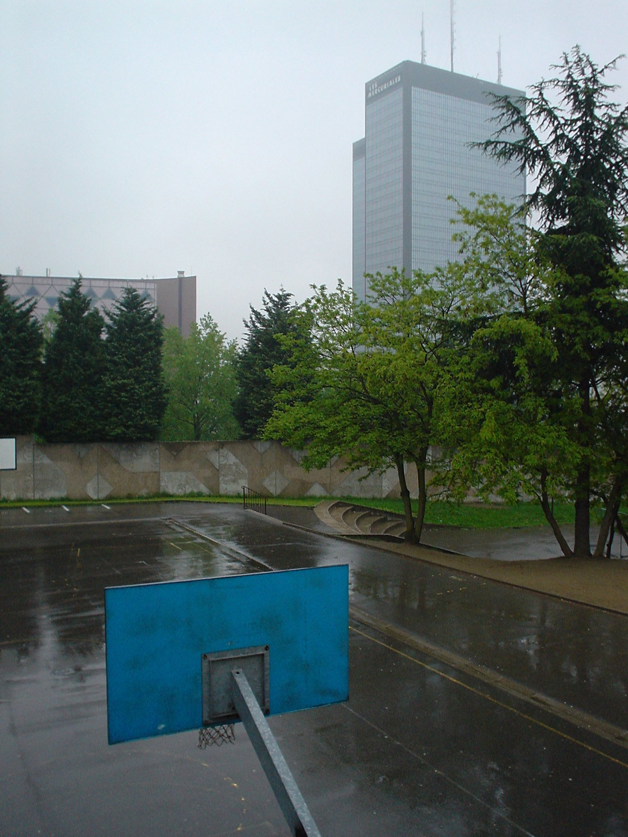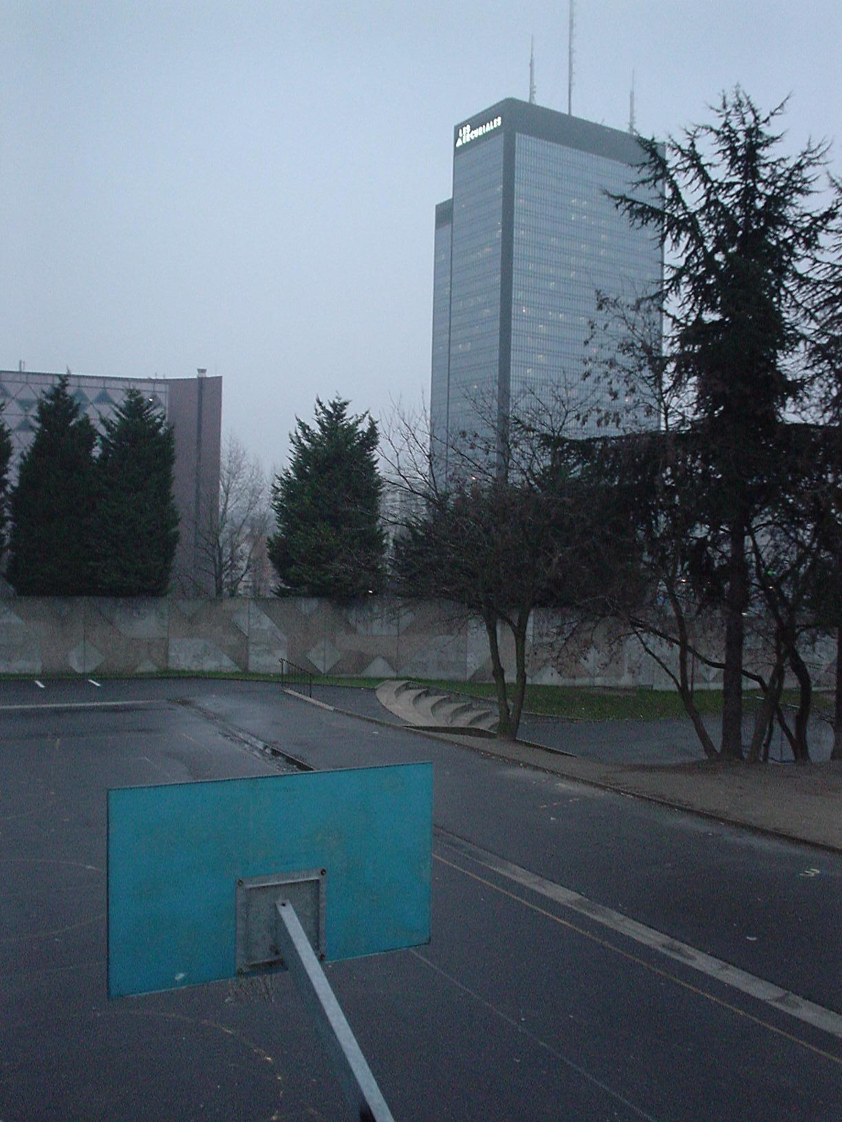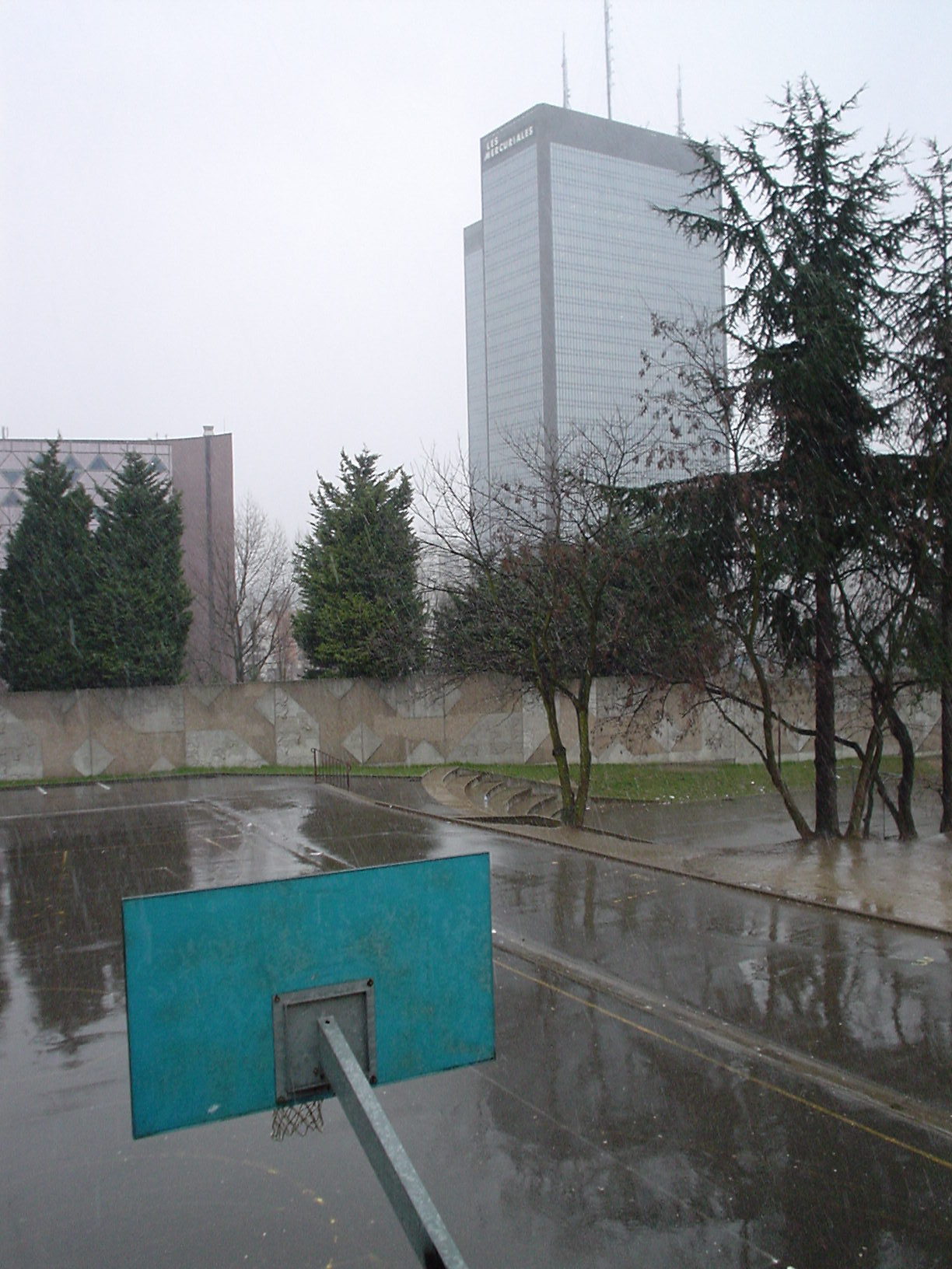Une tentative d’épuisement du paysage routinier à partir du point de vue que l’on obtient depuis la salle fumeurs des enseignants. Chaque photographie est donc le résultat d’une pause (clope) prise sur le travail. Les prises de vue sont réalisées de façon quotidienne et s’étendent sur l’année de septembre 2003 à juin 2004. Le cadrage est toujours le même et l’écoulement du temps au collège sur une année est rendu prégnant à l’image par le changement des saisons. Le temps s’imprime à l’image, les variations de lumière d’une prise de vue à l’autre et les fondus enchaînés évoquent les jours qui passent. Une année entière est ainsi condensée à l’image.