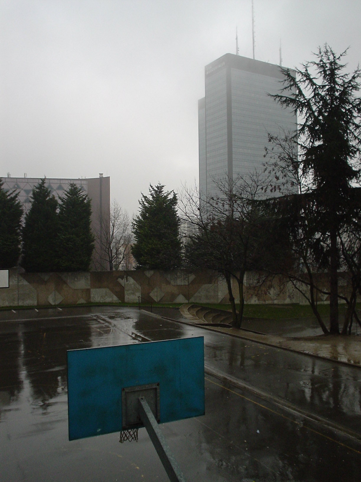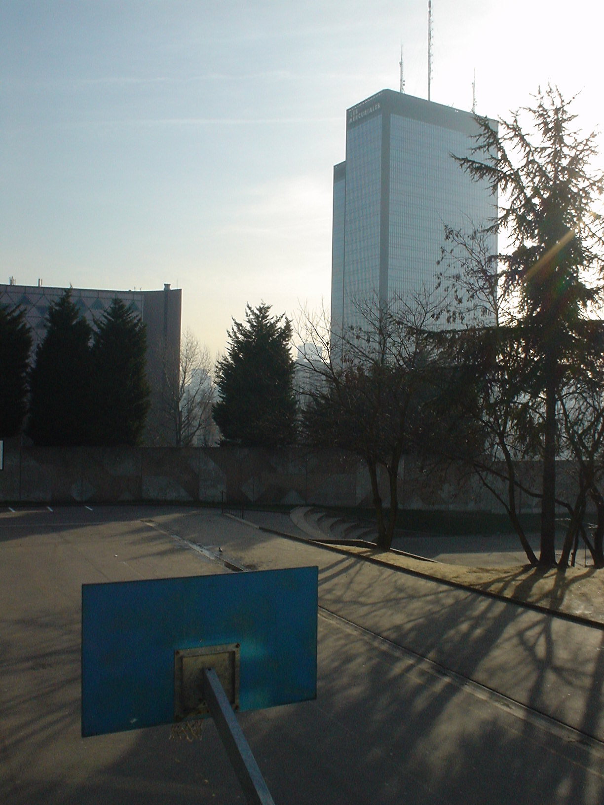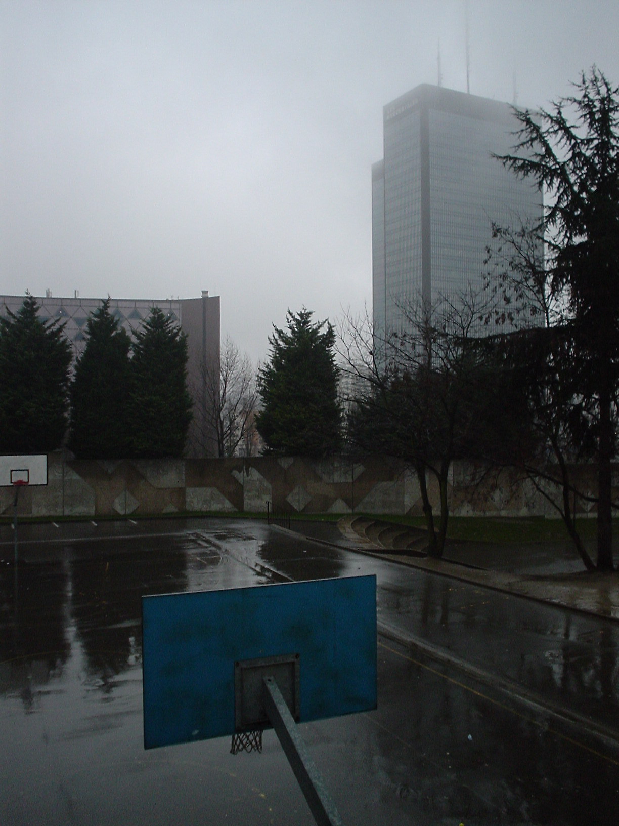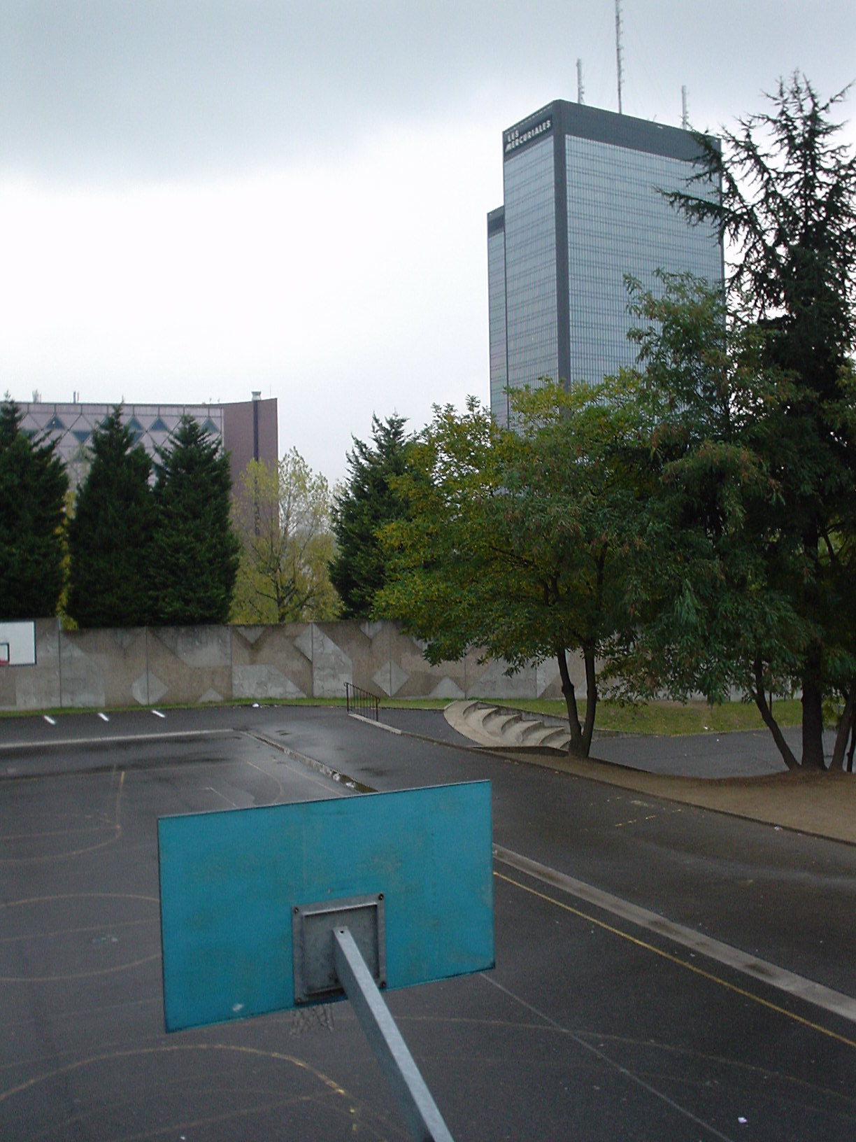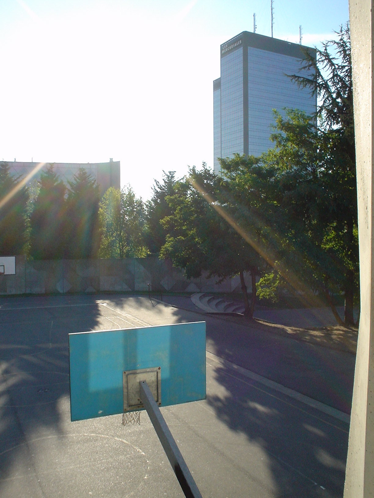 Une tentative d’épuisement du paysage routinier à partir du point de vue que l’on obtient depuis la salle fumeurs des enseignants. Chaque photographie est donc le résultat d’une pause (clope) prise sur le travail. Les prises de vue sont réalisées de façon quotidienne et s’étendent sur l’année de septembre 2003 à juin 2004. Le cadrage est toujours le même et l’écoulement du temps au collège sur une année est rendu prégnant à l’image par le changement des saisons. Le temps s’imprime à l’image, les variations de lumière d’une prise de vue à l’autre et les fondus enchaînés évoquent les jours qui passent. Une année entière est ainsi condensée à l’image.