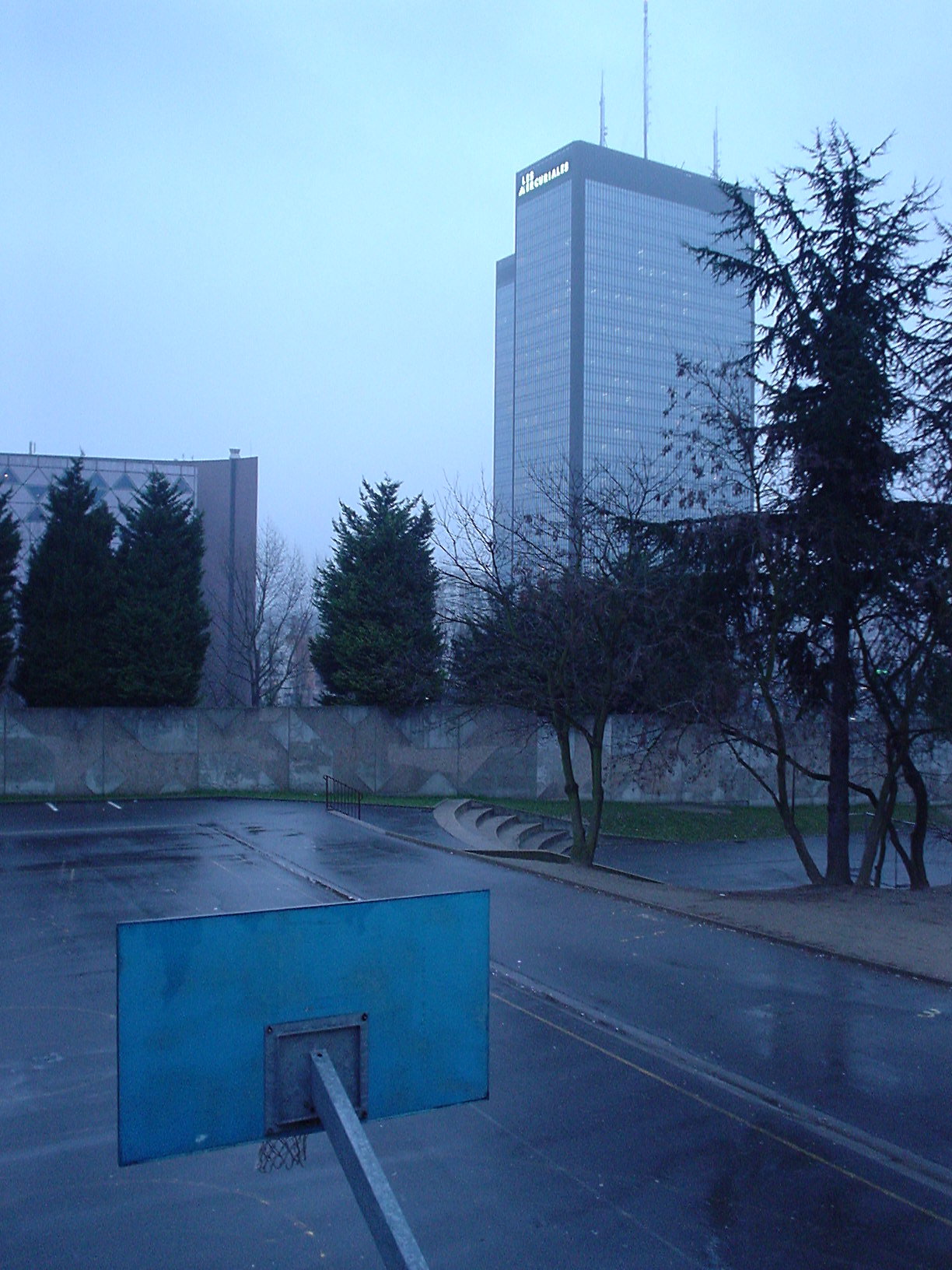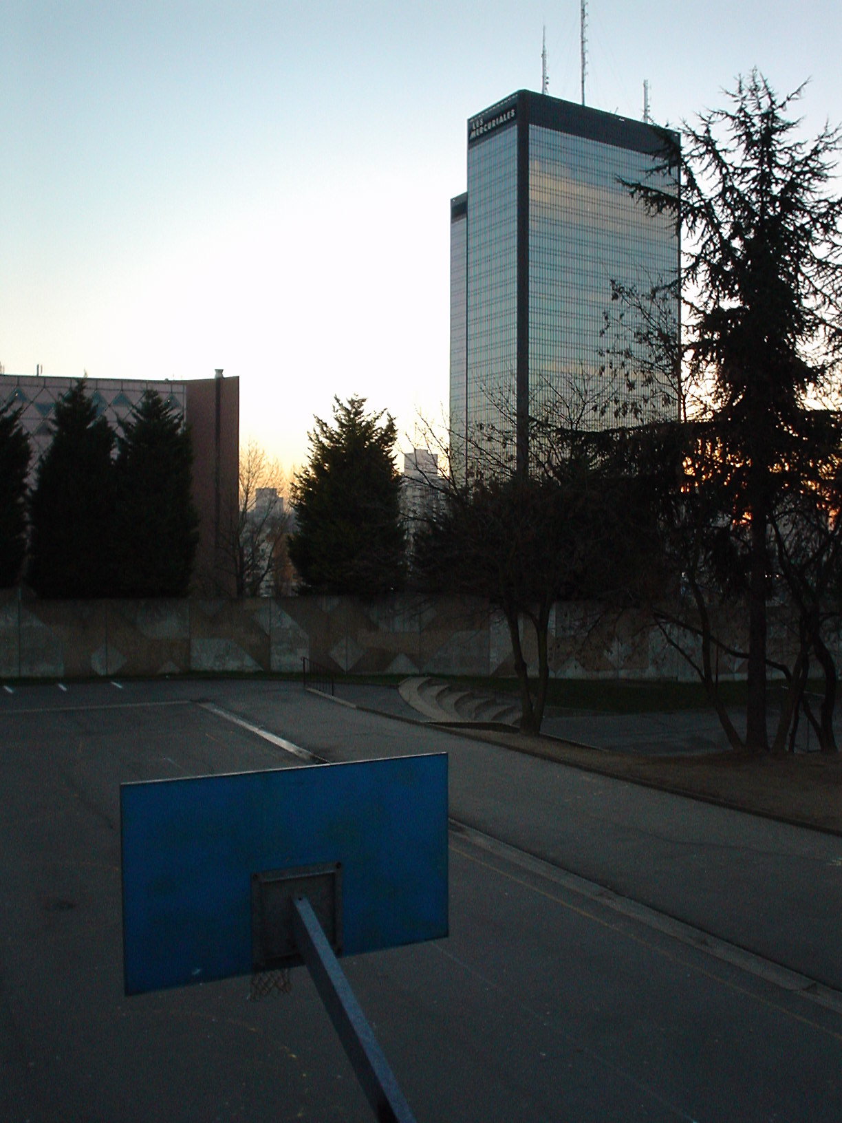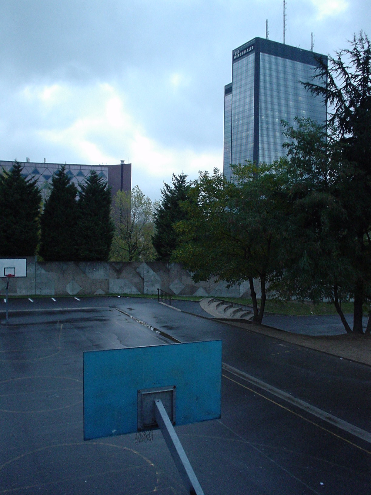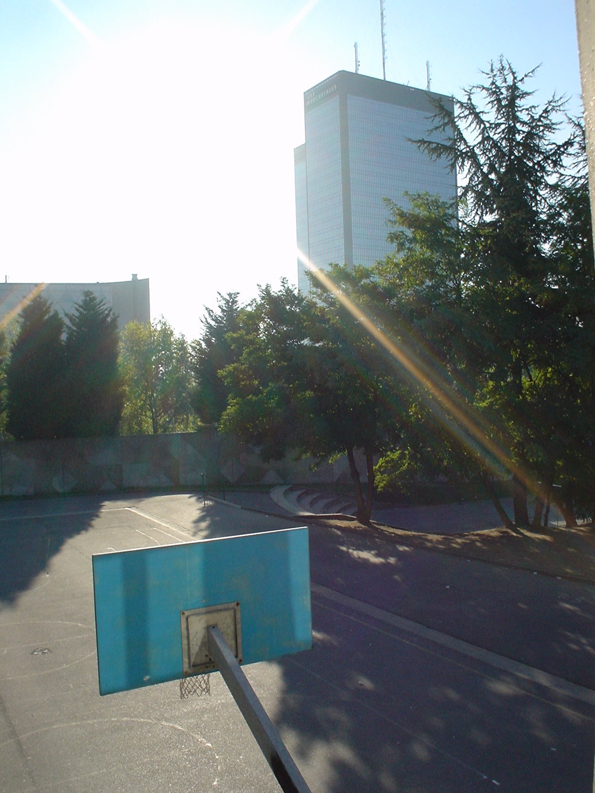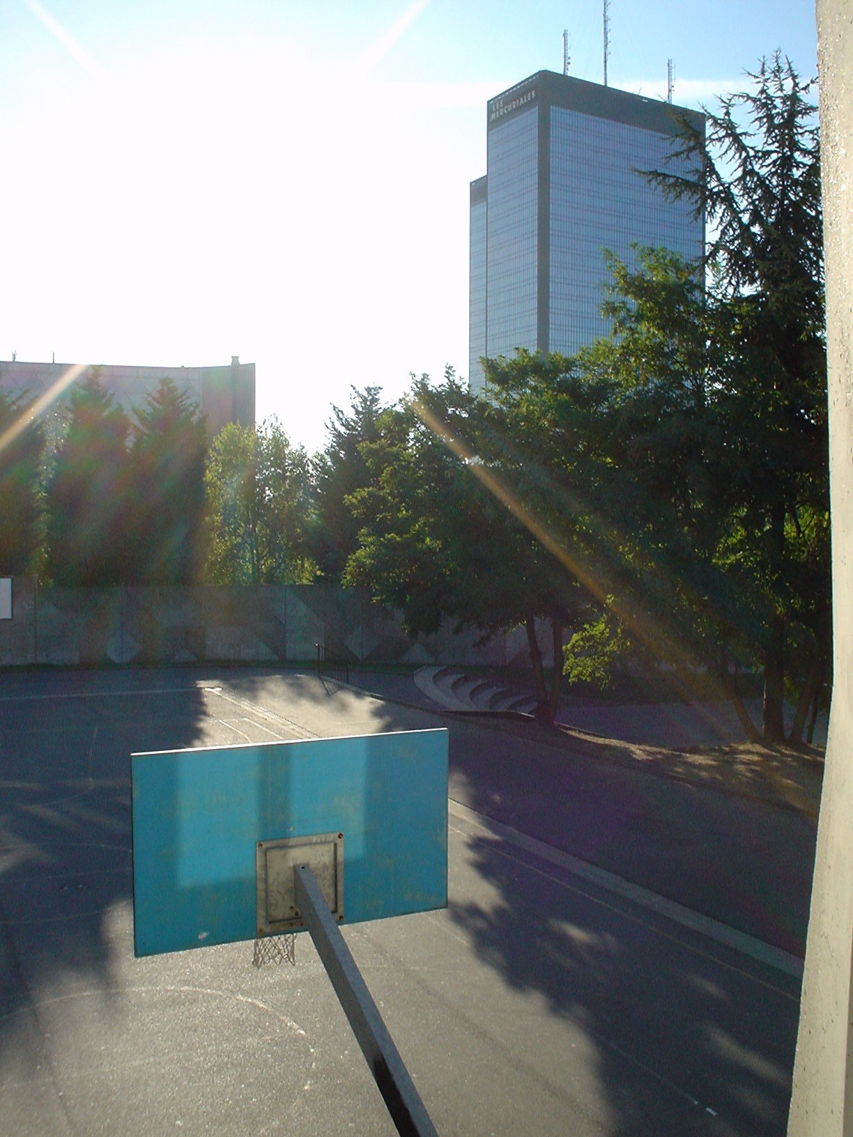 Une tentative d’épuisement du paysage routinier à partir du point de vue que l’on obtient depuis la salle fumeurs des enseignants. Chaque photographie est donc le résultat d’une pause (clope) prise sur le travail. Les prises de vue sont réalisées de façon quotidienne et s’étendent sur l’année de septembre 2003 à juin 2004. Le cadrage est toujours le même et l’écoulement du temps au collège sur une année est rendu prégnant à l’image par le changement des saisons. Le temps s’imprime à l’image, les variations de lumière d’une prise de vue à l’autre et les fondus enchaînés évoquent les jours qui passent. Une année entière est ainsi condensée à l’image.