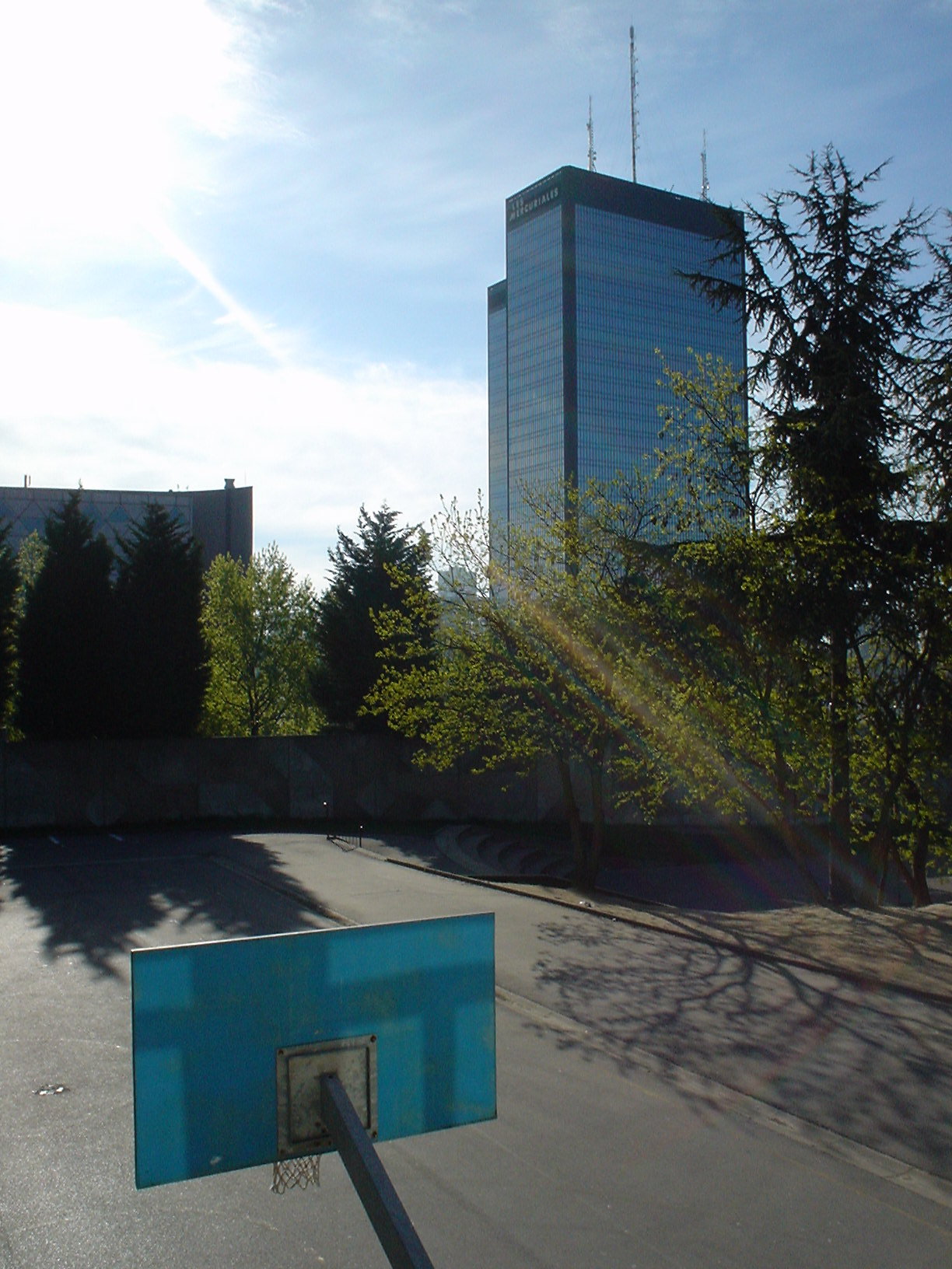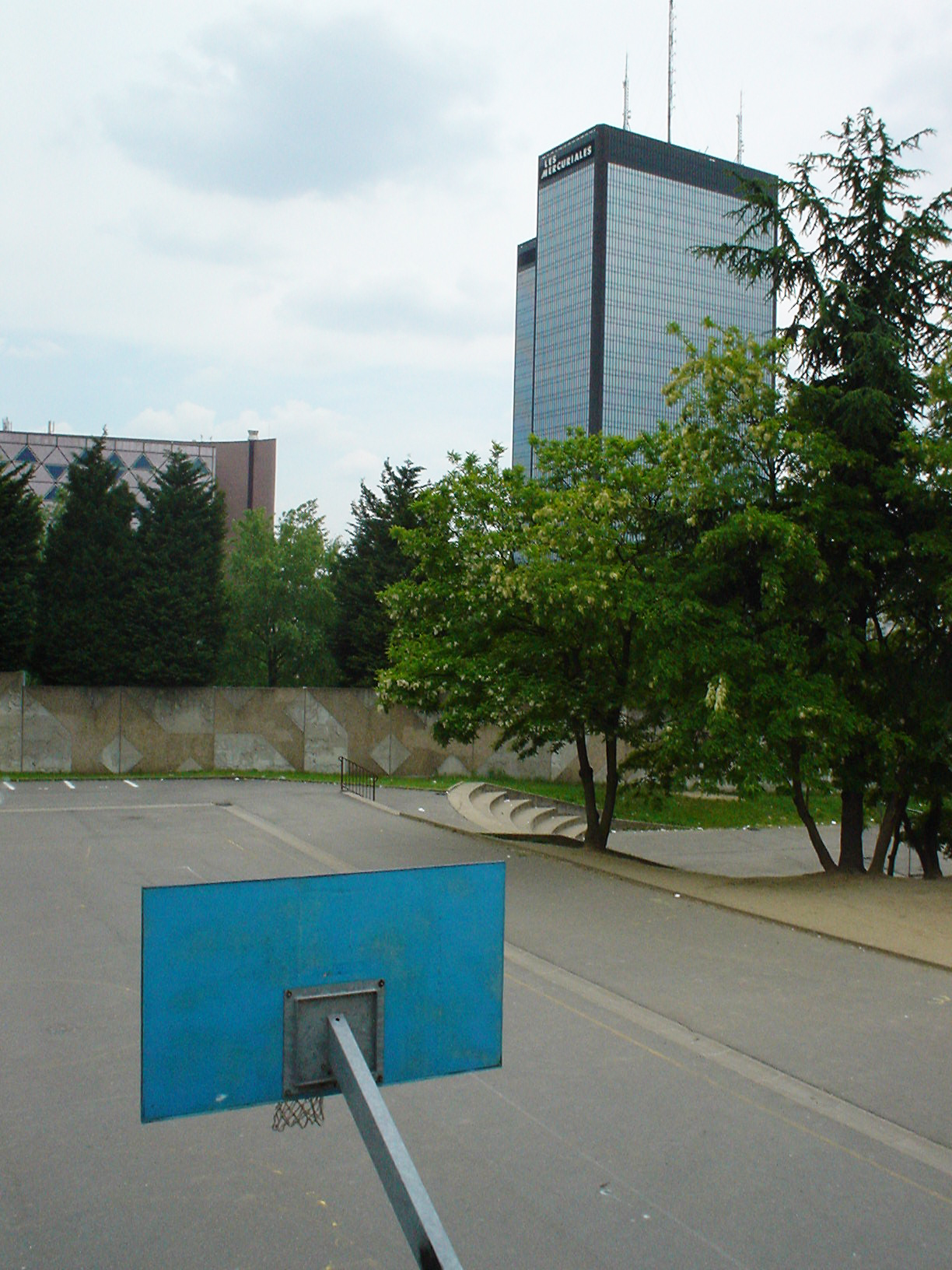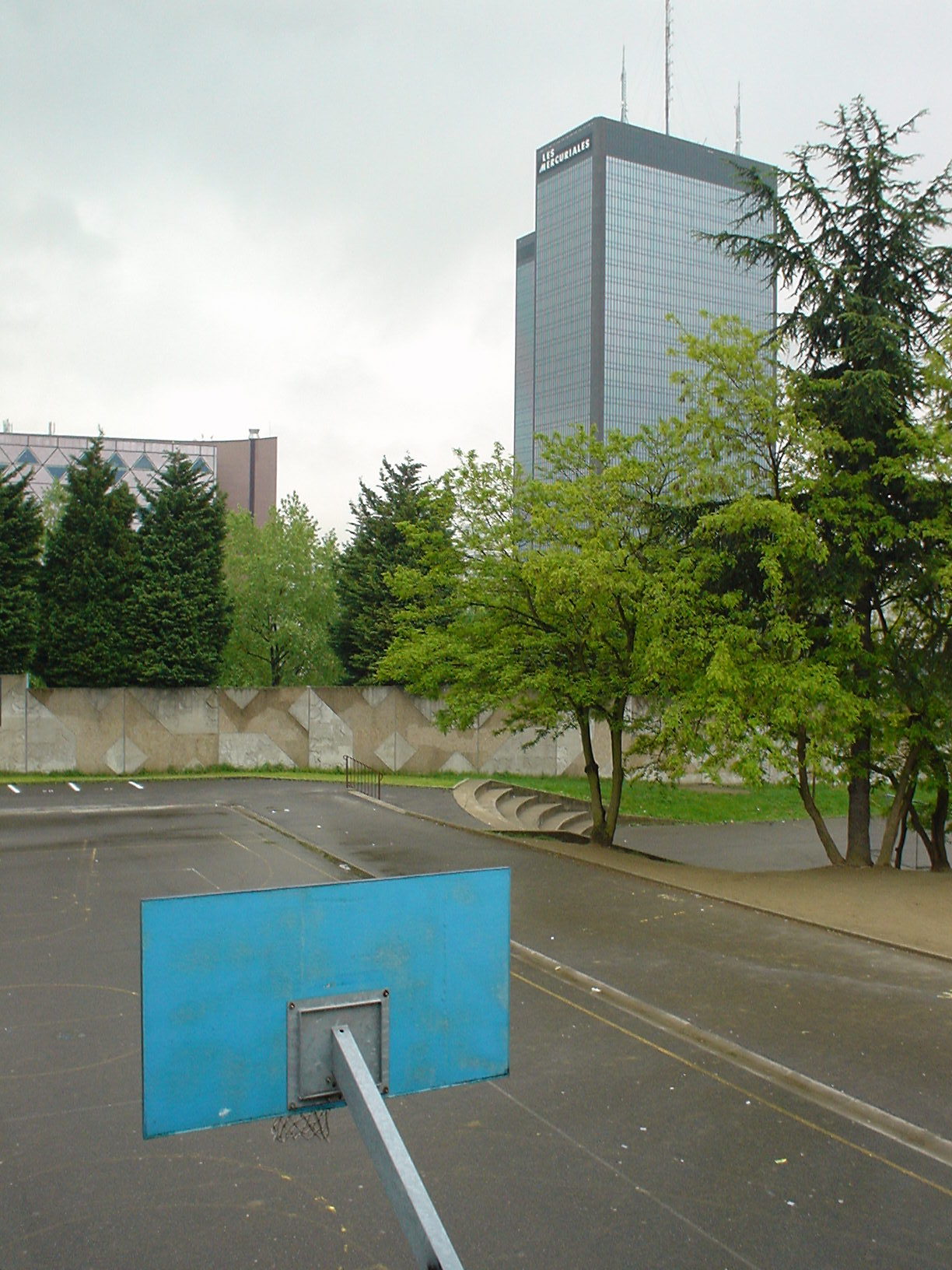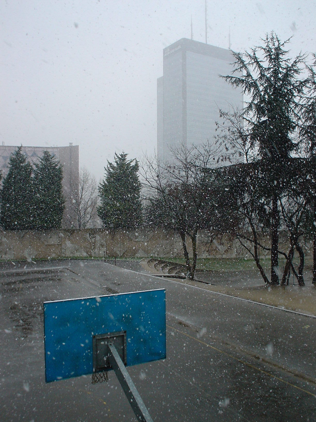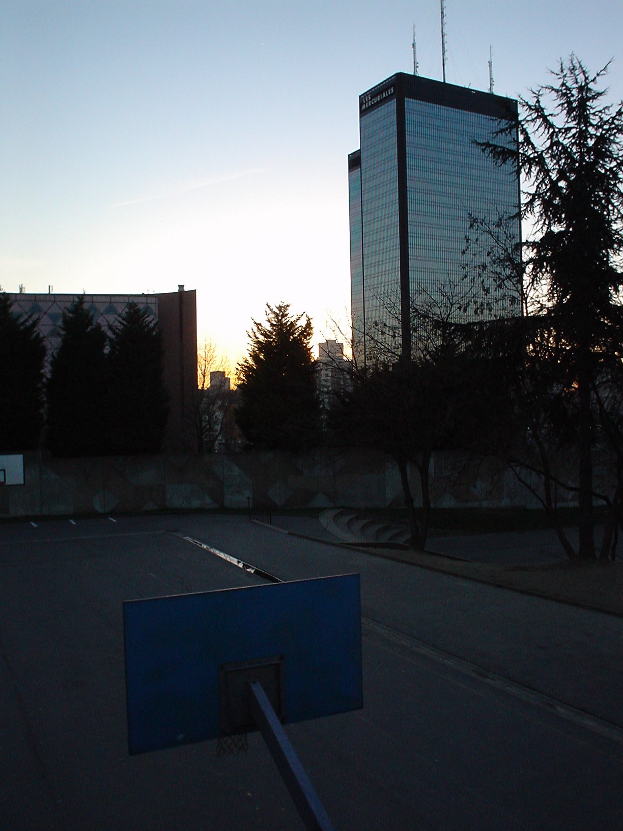 Une tentative d’épuisement du paysage routinier à partir du point de vue que l’on obtient depuis la salle fumeurs des enseignants. Chaque photographie est donc le résultat d’une pause (clope) prise sur le travail. Les prises de vue sont réalisées de façon quotidienne et s’étendent sur l’année de septembre 2003 à juin 2004. Le cadrage est toujours le même et l’écoulement du temps au collège sur une année est rendu prégnant à l’image par le changement des saisons. Le temps s’imprime à l’image, les variations de lumière d’une prise de vue à l’autre et les fondus enchaînés évoquent les jours qui passent. Une année entière est ainsi condensée à l’image.