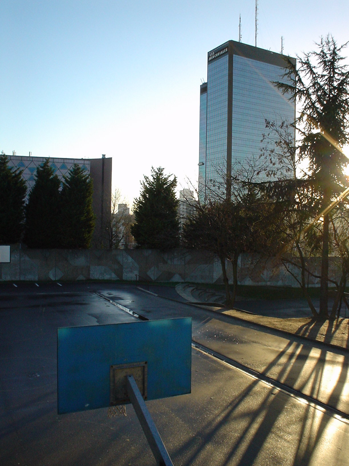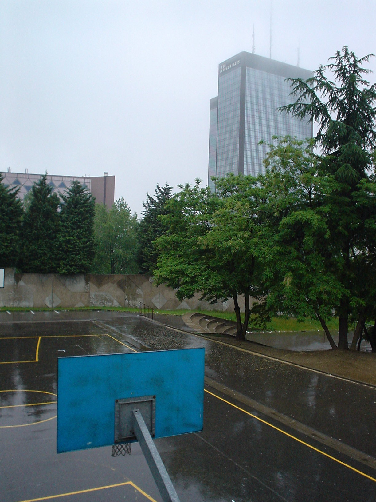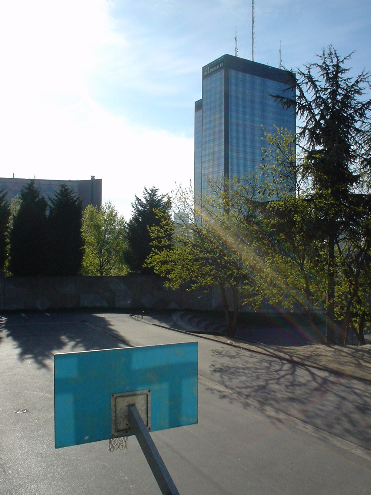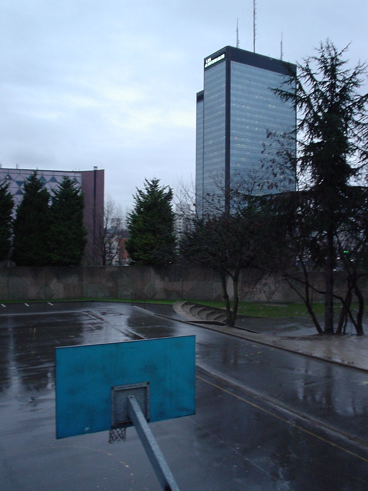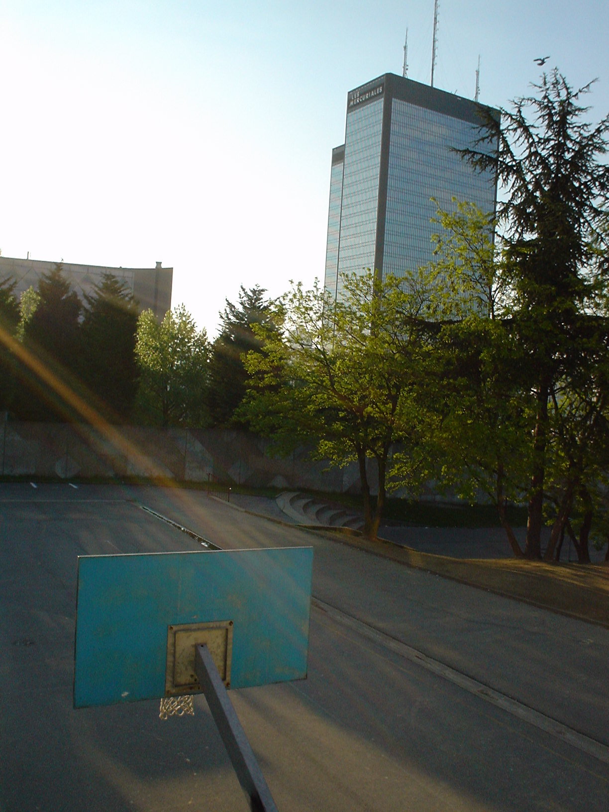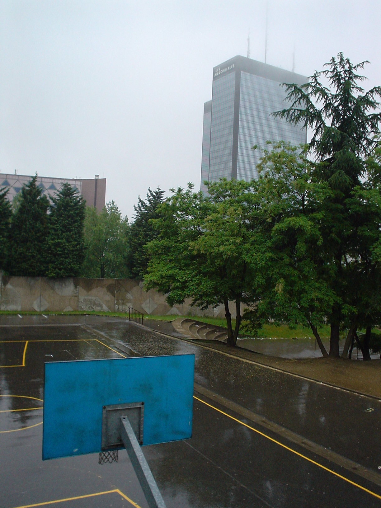 Une tentative d’épuisement du paysage routinier à partir du point de vue que l’on obtient depuis la salle fumeurs des enseignants. Chaque photographie est donc le résultat d’une pause (clope) prise sur le travail. Les prises de vue sont réalisées de façon quotidienne et s’étendent sur l’année de septembre 2003 à juin 2004. Le cadrage est toujours le même et l’écoulement du temps au collège sur une année est rendu prégnant à l’image par le changement des saisons. Le temps s’imprime à l’image, les variations de lumière d’une prise de vue à l’autre et les fondus enchaînés évoquent les jours qui passent. Une année entière est ainsi condensée à l’image.