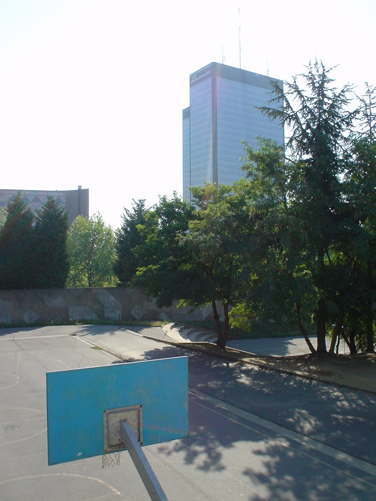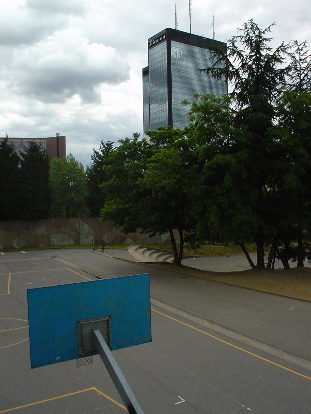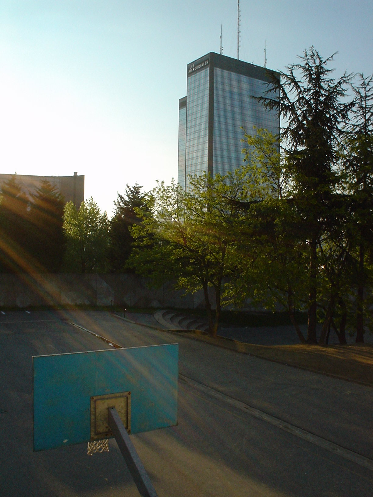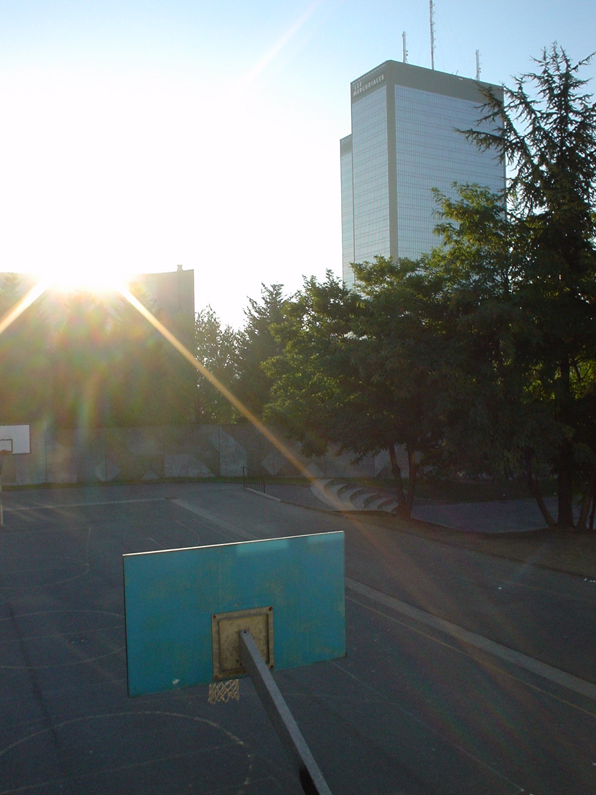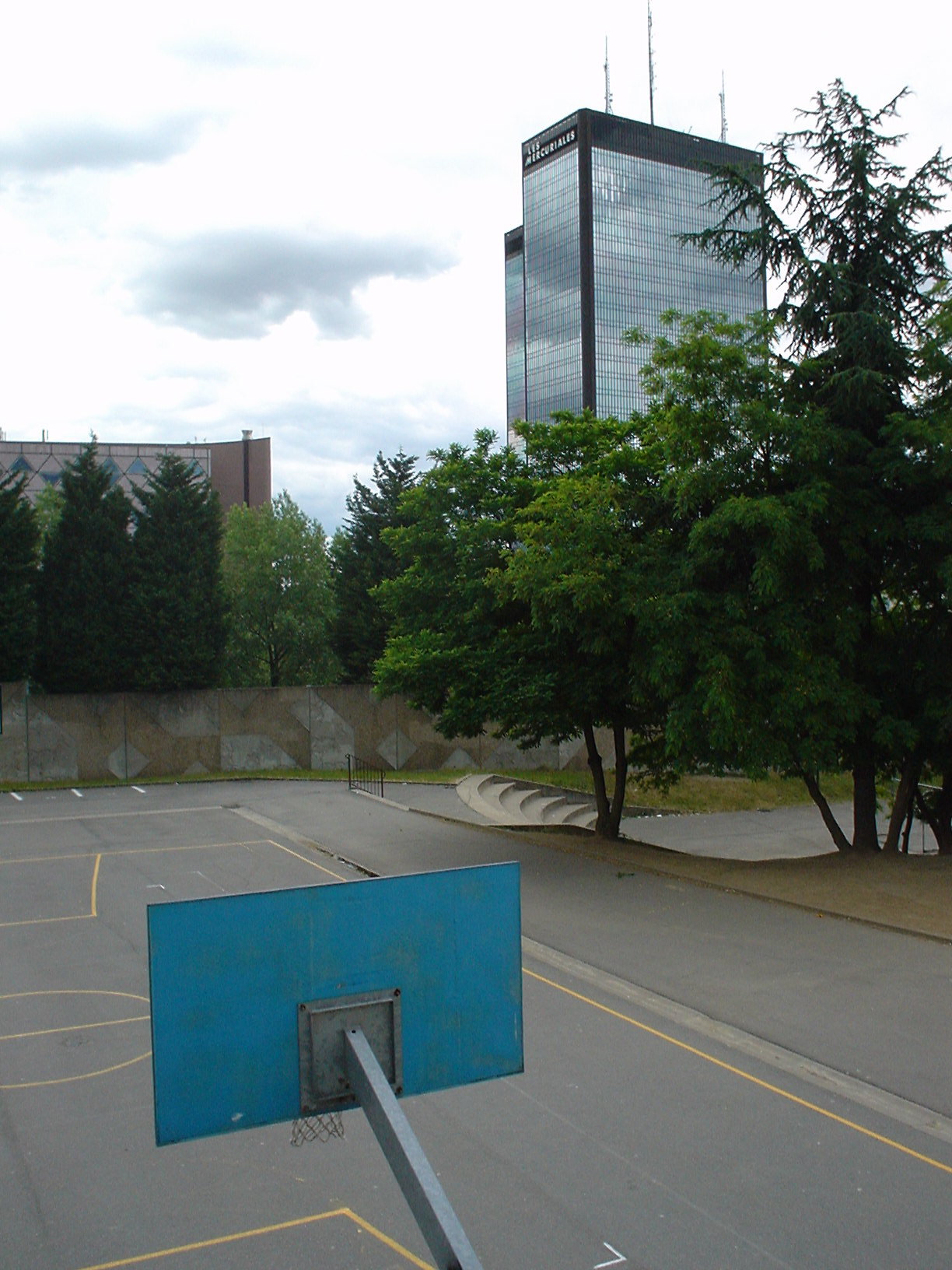 Une tentative d’épuisement du paysage routinier à partir du point de vue que l’on obtient depuis la salle fumeurs des enseignants. Chaque photographie est donc le résultat d’une pause (clope) prise sur le travail. Les prises de vue sont réalisées de façon quotidienne et s’étendent sur l’année de septembre 2003 à juin 2004. Le cadrage est toujours le même et l’écoulement du temps au collège sur une année est rendu prégnant à l’image par le changement des saisons. Le temps s’imprime à l’image, les variations de lumière d’une prise de vue à l’autre et les fondus enchaînés évoquent les jours qui passent. Une année entière est ainsi condensée à l’image.