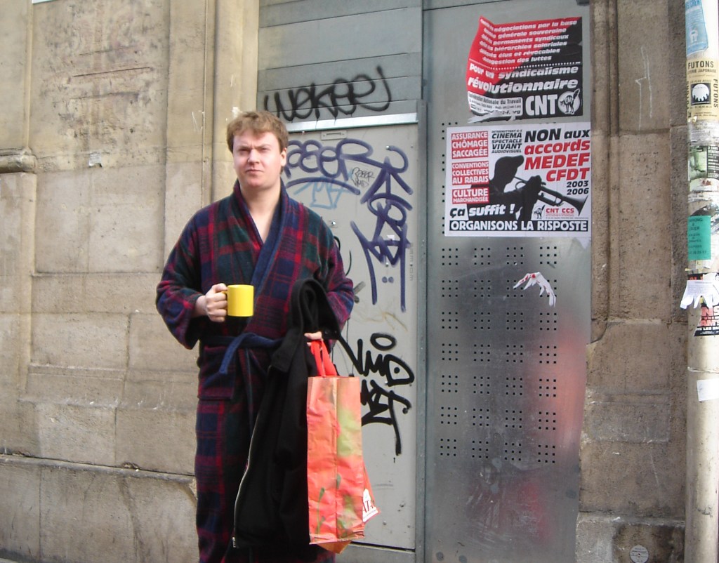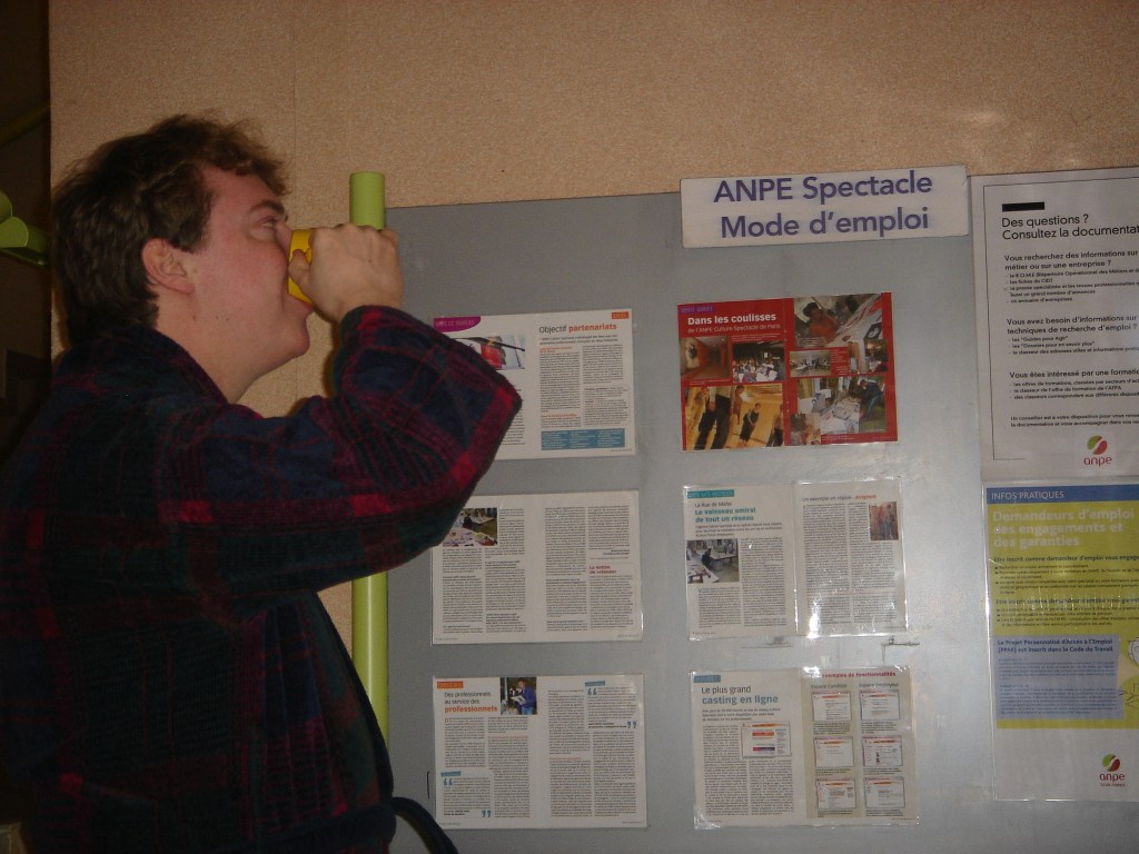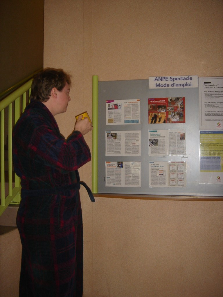 En 2007, je m’amusais à scruter les annonces d’emploi dans l’agence de l’ANPE des intermittents du spectacle (à l’époque située rue de Malte à Paris), mais vêtu d’un peignoir et pourvu d’une tasse de café à la main. Je jouais au chômeur de longue durée qui, en quête perpétuelle d’un emploi, a décidé d’habiter au quotidien ce bâtiment austère, mais hautement symbolique, car, par ailleurs, déjà occupé lors des différentes luttes des travailleurs du spectacle contre la précarité et les contre-réformes de l’assurance chômage (portées par le MEDEF et les gouvernements successifs).