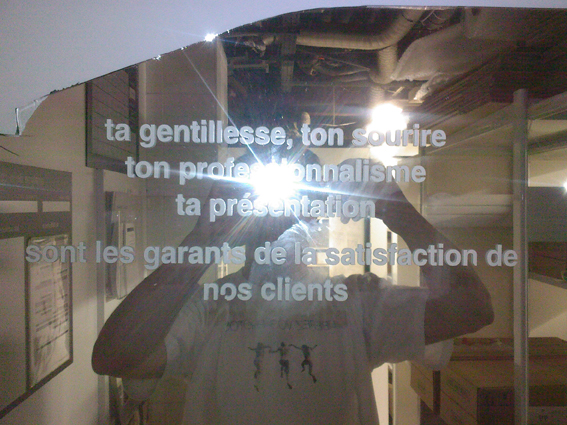 Je documente mes situations de travail (gestes dans la chaîne de production, scènes de la vie quotidienne, jeux entre collègues…) et j’enregistre avec mon téléphone mobile (des photos, des vidéos et des sons) ; je me sers à mon compte des marchandises disponibles (cadres, films 135mn, CD’s et DVD’s…) ou des déchets (je recycle la « gâche » photographique et les photos d’identité trouvées dans les poubelles…) et j’utilise aussi ma position pour réaliser une multitude de petites actions (je me réapproprie les moyens de production pour faire des tirages, calendriers, books photos… j’improvise des jeux de rôle avec les objets de la boutique pour la caméra de mon téléphone portable…), mais aussi pour faire de l’information syndicale.