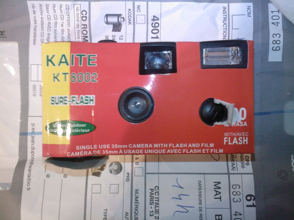 La double vie du PAP (une hypothèse) : Vendu une première fois à un touriste, le voilà développé dans le pays visité. L’appareil n’a pas été jeté par l’opérateur, il a été récupéré pour servir à nouveau. On y a placé un nouveau film et scotché du ruban adhésif noir autour pour le protéger de la lumière. Je considère cet objet comme un juste retour de la balle à l’envoyeur qui en plus — par la trace du détournement qu’il laisse apparaître — exprime un savoir-faire tactique qui me plaît.