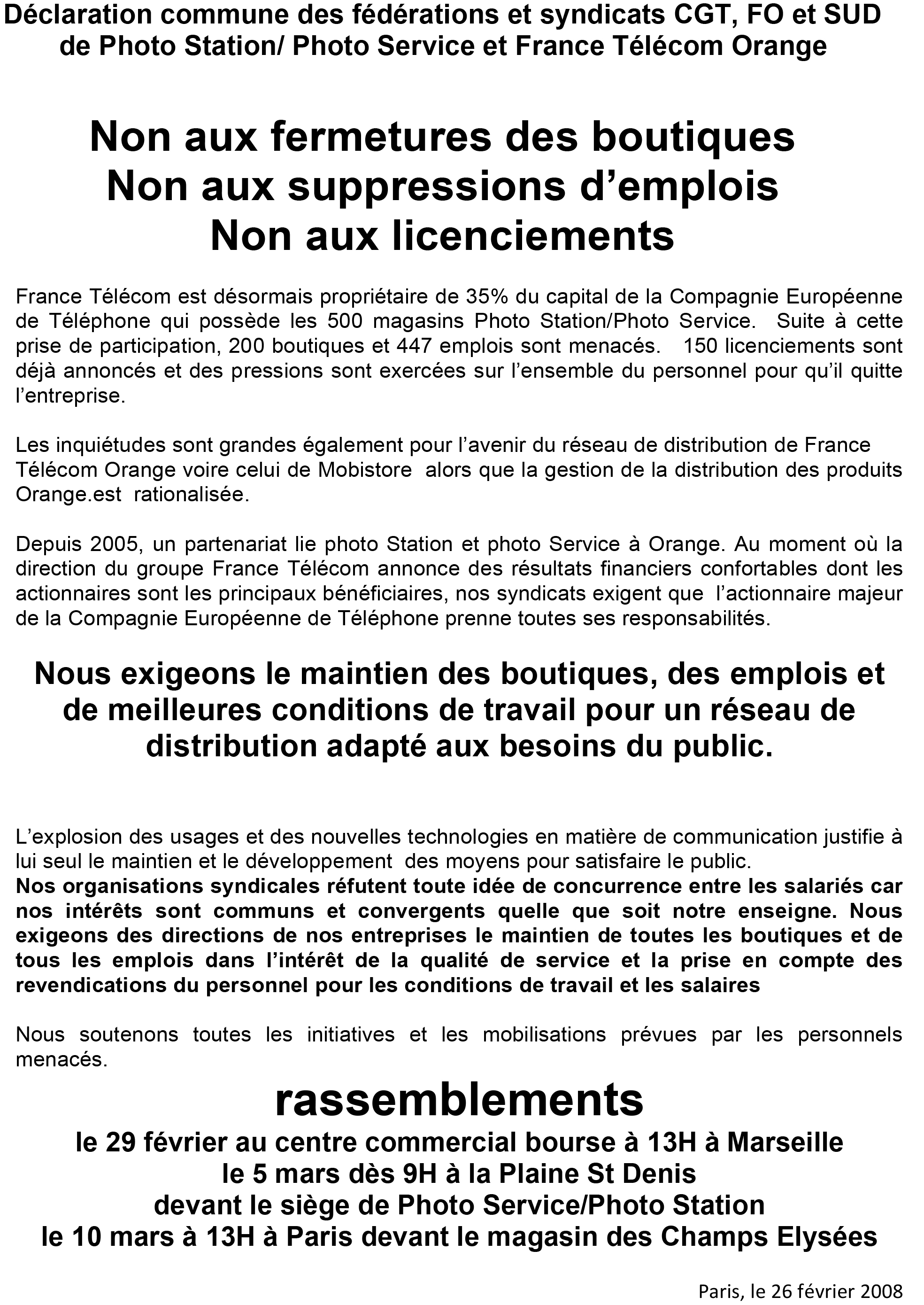 Aussi, en préparation de ces journées d’action, et avec la complicité de la section de Force Ouvrière – Photo Service Photos Station – de Marseille, le 28 février 2008, j’ai également accueilli une journaliste de France Info dans notre magasin Photo Service Italie II pour répondre à ses questions et alerter l’opinion publique sur les menaces de licenciements qui planaient sur les employés de l’entreprise, pour dénoncer la fermeture et la restructuration des magasins et pointer du doigt les conditions de réaffectation des salariés dans les boutiques « relooker » Orange, puisque le groupe France Télécom montait petit à petit au capital de nos entreprises.