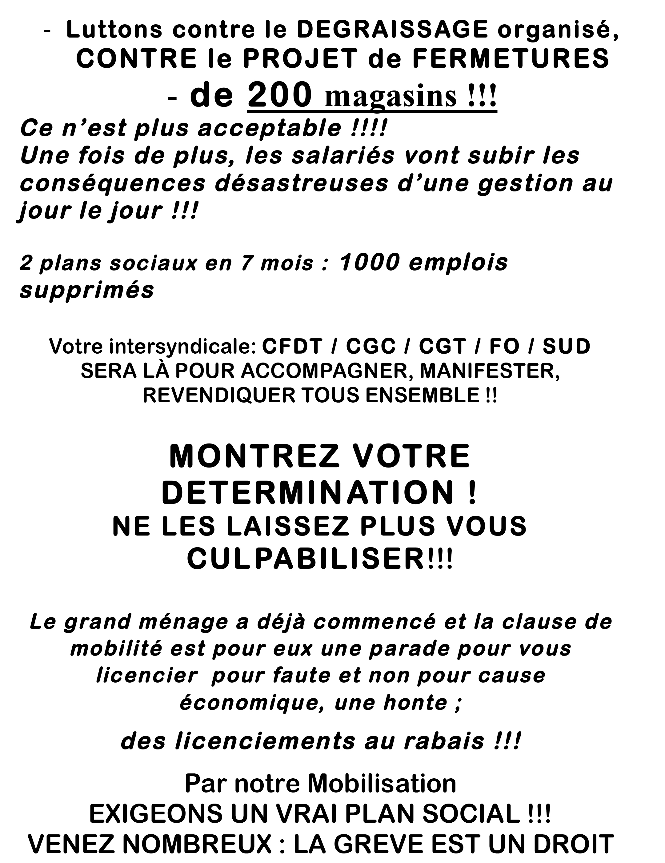 Lors de la grève du 10 mars 2008, j’ai tout de même pu compter sur le soutien d’au moins deux de mes collègues. Cependant, comme elles avaient peur des représailles, elles n’ont pas osé débrayer avec moi et ont préféré ne pas venir travailler au magasin ce jour de grève. L’une de ces deux collègues grévistes est tout de même venue au centre commercial, mais elle a préféré rester cachée, en dehors de la zone de surveillance de notre hiérarchie, avant de m’accompagner, en début d’après-midi, rejoindre les autres collègues grévistes devant le magasin des Champs Élysées. Ce jour-là, j’étais donc venu travailler le matin, mais en prévenant tous mes collègues (la hiérarchie y comprise) qu’à partir de midi tapante, je débrayerai et me mettrai en grève. Lorsque midi fut arrivé, je quittais mon poste de travail, je pris ma pile de tracts et commençais à les distribuer aux clients à l’entrée de notre magasin.