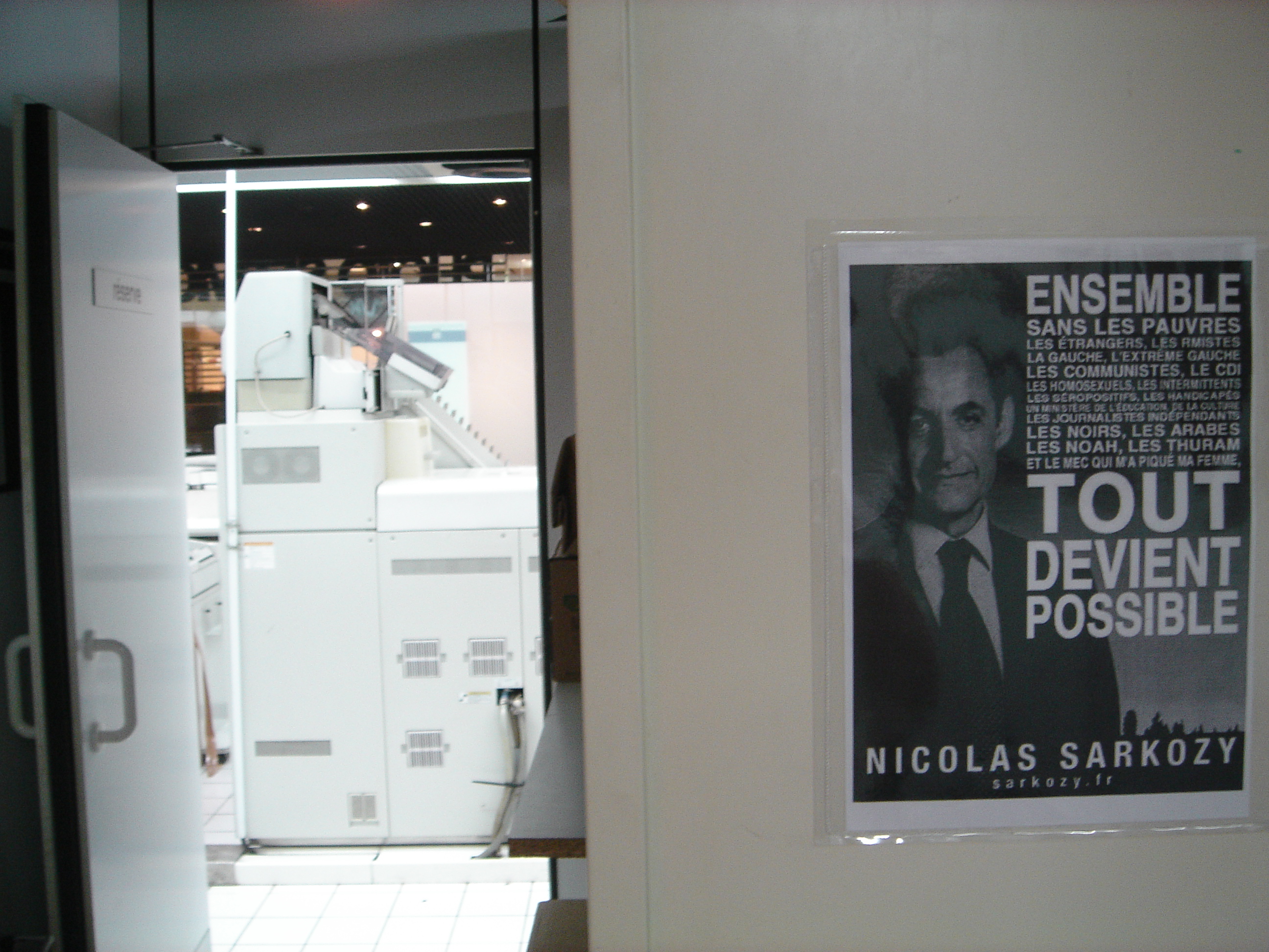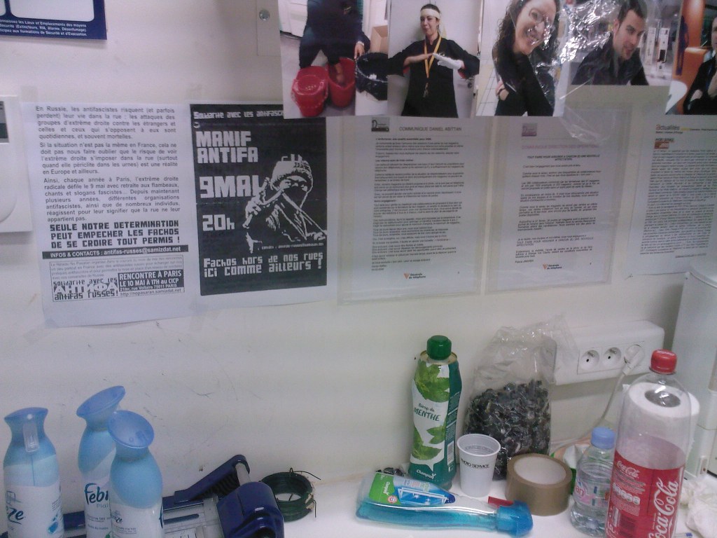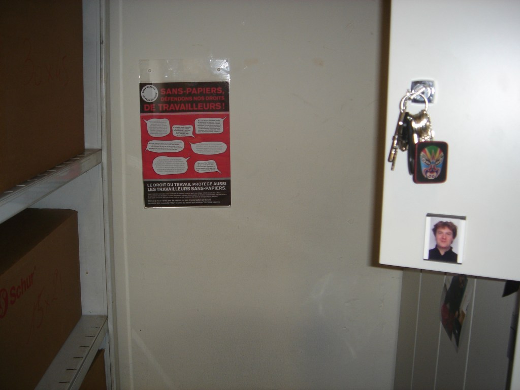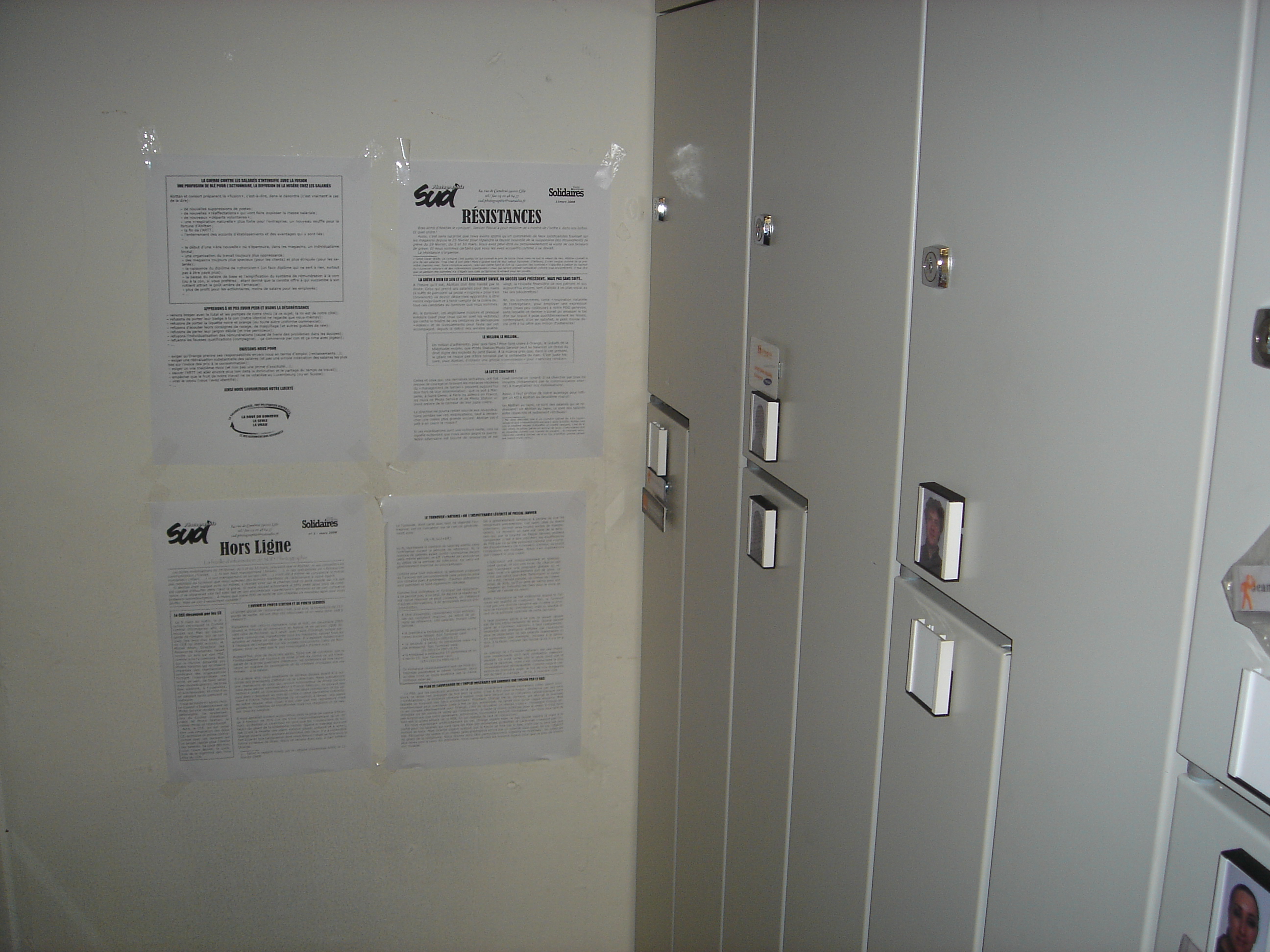 Ainsi, comme il n’y avait pas de panneau prévu pour l’information syndicale à destination des employés, je faisais de l’affichage « sauvage » dans la remise du personnel qui faisait office de salle de pose et de déjeuner, mais qui servait aussi, et avant tout, de réserve (de magasin pour les produits et matières premières), de vestiaire (pour se changer) et de bureau pour l’équipe responsable du magasin.