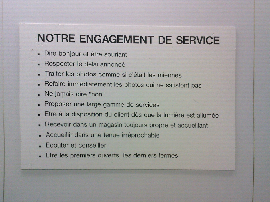 Pour l’essentiel, je m’occupais avec mes collègues d’accueillir les clients, de prendre en charge leurs commandes de tirages (argentique et numérique) en rédigeant les enveloppes qui servaient au bon suivi des commandes, de réaliser leurs photos d’identité, d’encaisser le montant de leurs travaux, de leur proposer à la vente toutes sortes de produits allant des cartes de fidélité aux cadres en bois, en passant par des books photo.