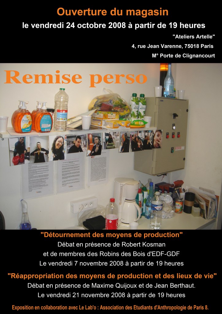 Remise perso, c’est le titre de l’exposition, était une sorte d’« exposition-bilan » des 18 mois que j’avais passés comme salarié de Photo Service. Celle-ci se présentait sous la forme d’un vrai-faux magasin, où je faisais bénéficier les visiteurs de ma « remise perso » : je me proposais donc de faire concurrence à la chaîne qui m’employait. Les différents documents exposés n’étaient évidemment pas à vendre, je cherchais juste à créer un simulacre de magasin photo-service à partir d’objets volés ou perruqués. Ce magasin était une façon d’ouvrir la porte de la « remise du personnel » (ou du personnel remisé) et de montrer ainsi ce qui reste habituellement caché aux yeux du public (bulletins de paye, luttes syndicales, consignes assignées au personnel, vestiaires, réserve, jeux entre collègues, différents documents présentant les traces d’un « vivre ensemble » au quotidien, etc.).