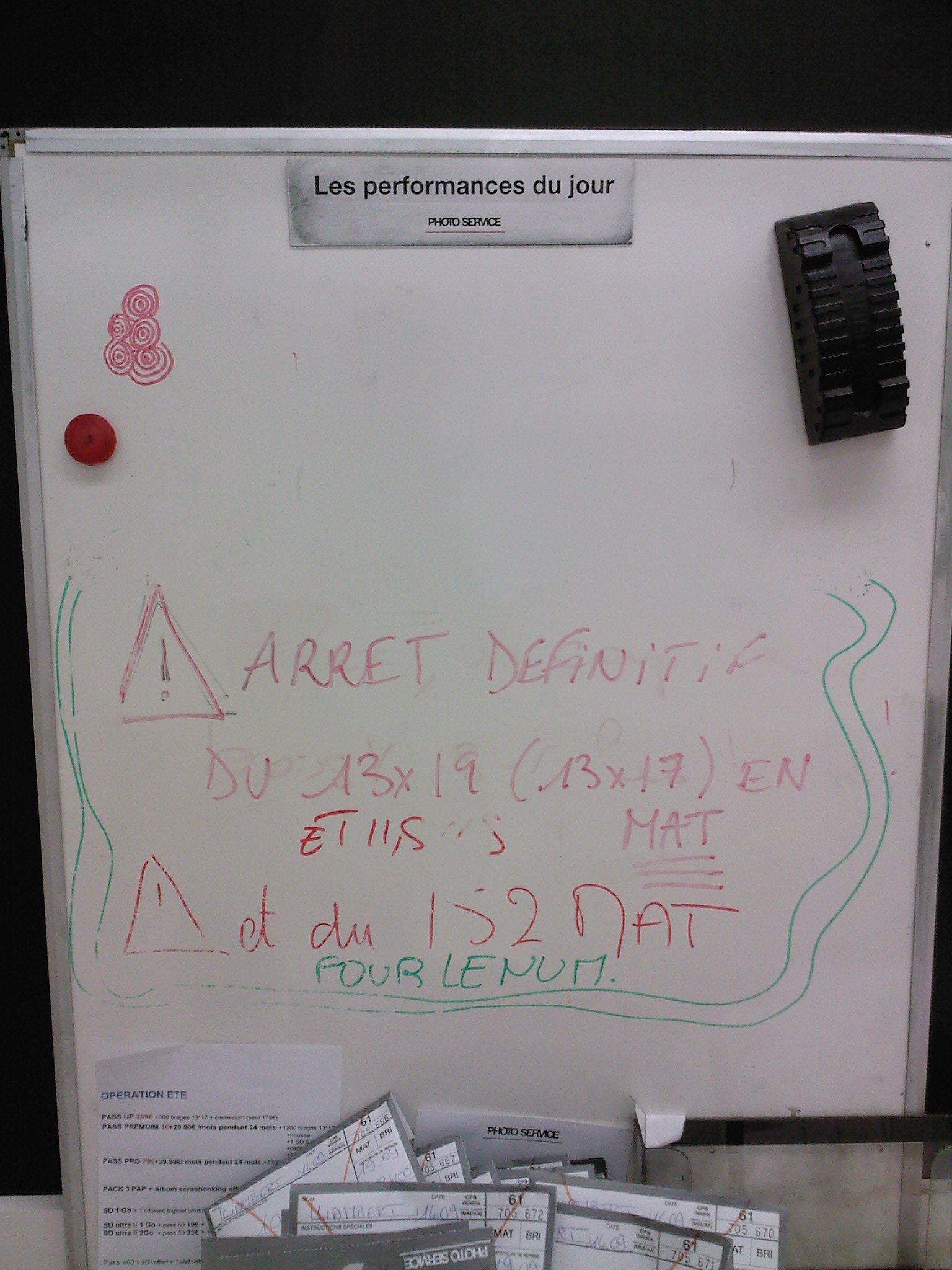 Nous avons arrêté les tirages en papier mat et différents formats que nous pouvions proposer, car il ne nous restait plus qu’un seul mini-lab et quatre nouvelles « bornes » informatisées avaient été installées afin de mettre délibérément les clients au travail. C’est le nouveau management d’Orange qui prenait petit à petit les commandes, et planifiait la réduction du personnel Photo Service tout en orchestrant la pénurie des moyens de production pour le secteur photo. C’était aux clients désormais de réaliser leurs propres commandes photographiques. Avant les travaux de restructuration, le responsable du magasin m’avait demandé si je souhaitais passer en téléphonie ou rester en photographie, j’étais photographe, j’avais donc choisi la photographie (mauvaise pioche !?). Ainsi, pendant les travaux qui ont durée du mois de septembre à novembre 2007, une grande partie de l’équipe (ils étaient huit sur vingt-deux) a rejoint la formation en téléphonie assurée par Orange et l’autre partie des effectifs (les quatorze restés en photo) a rejoint le magasin Photo Service au 67 rue de Sèvres dans le 6ème arrondissement de Paris (aujourd’hui c’est une boutique Orange qui fait face au grand magasin Bon Marché) pour traiter les commandes prises dans les deux kiosques du centre commercial d’Italie 2 qui continuaient d’ouvrir et où, à tour de rôle, nous nous relayions afin d’y accueillir les clients du magasin fermé.