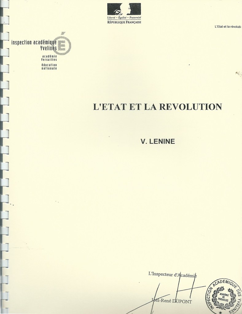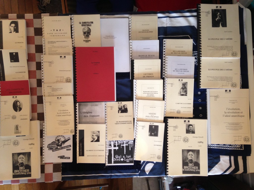 Bien entendu, je ne me suis pas contenté d’enregistrer les sons des machines, je m’en suis également servi notamment pour réaliser de nombreuses éditions clandestines3. Avec toutes ces machines et ces outils à disposition, nous avions largement de quoi nous occuper, car, en plus de la littérature que nous pouvions emmener avec nous et lire sur place, nous disposions d’un poste informatique connecté à internet qui nous permettait de trouver chaque jour de nouveaux textes à imprimer. Ce poste informatique était particulièrement bien placé puisqu’il était installé dans le coin opposé à l’entrée d’un bureau fermable, c’est-à-dire qu’il était situé précisément dans l’angle mort du public contenu par le comptoir qui définissait la zone limite où il devait se tenir pour nous passer commande. De cette façon, nous pouvions également imprimer directement sur place notre propre « littérature » à partir des fichiers texte disponibles et trouvés sur le Net. Je pouvais ainsi m’adonner à l’édition clandestine de nombreux textes, ou plus exactement me consacrer à leur « réédition », car, comme le fait remarquer à juste titre Leszek Brogowski, je réalisais « toutes sortes de perruques, en faisant en particulier des rééditions, pas nécessairement pirates, car certaines œuvres se trouvaient déjà dans le domaine public4 ». Cependant, si ces rééditions n’étaient effectivement pas toujours pirates, elles étaient néanmoins « customisées » puisque je me servais des sigles et du sceau de l’institution qui m’employait et m’amusais ainsi à les personnaliser en apposant et en estampillant les en-têtes de l’IA, la signature de l’inspecteur académique, et son non moins officiel tampon (dont nous disposions pour la reproduction des documents officiels) sur les premières de couverture de publications telles que 1984 de George Orwell, Le Capital de Karl Marx, L’Insurrection qui vient du Comité invisible, ou encore L’Honnête Voleur de Dostoïevski, etc.