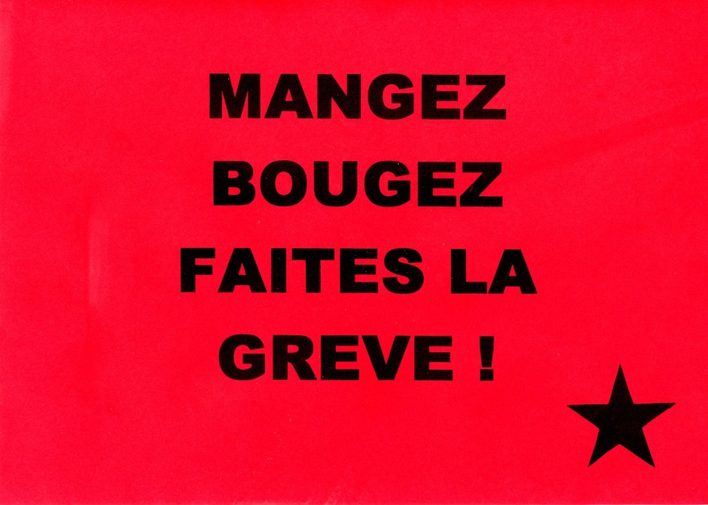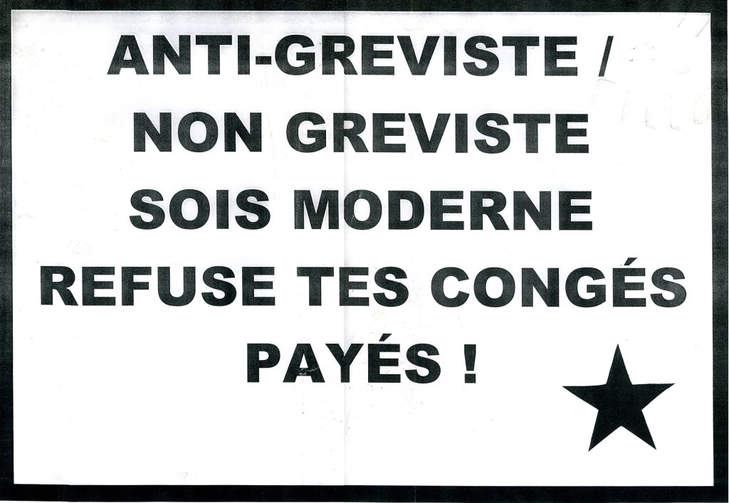 ou encore d’autres affiches, comme celles imaginées par un groupe politique affinitaire qui revendiquait ces slogans : « Anti-gréviste / non-gréviste sois moderne refuse tes congés payés ! » et « Mangez, Bougez, faites la grève ! ».