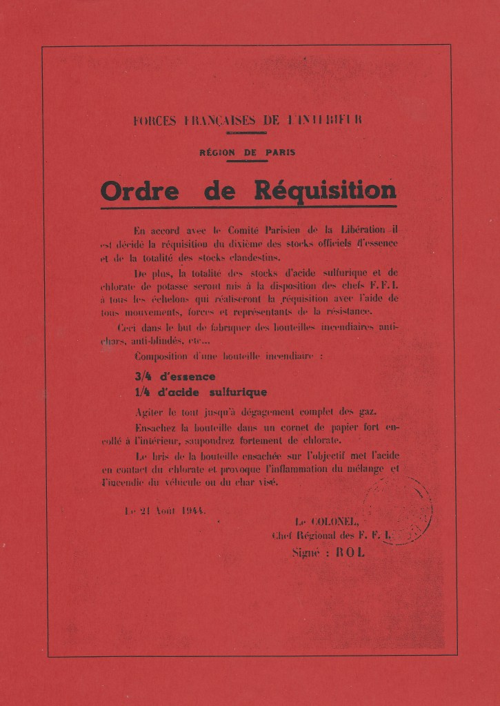 J’ai réédité également d’autres types de textes : des brochures d’information et de formation syndicales, des textes politiques et artistiques, mais aussi des tracts et des affichettes – comme l’« Ordre de Réquisition » émit par le Comité Parisien de la Libération et signé le 21 août 1944 par le colonel Rol-Tanguy (chef régional des F.F.I.), qui ordonnait par la présente la réquisition des stocks d’essence, d’acide sulfurique et de chlorate pour la fabrication de bouteilles incendiaires antichars et anti-blindées dont il donnait dans ses moindres détails la « recette » –