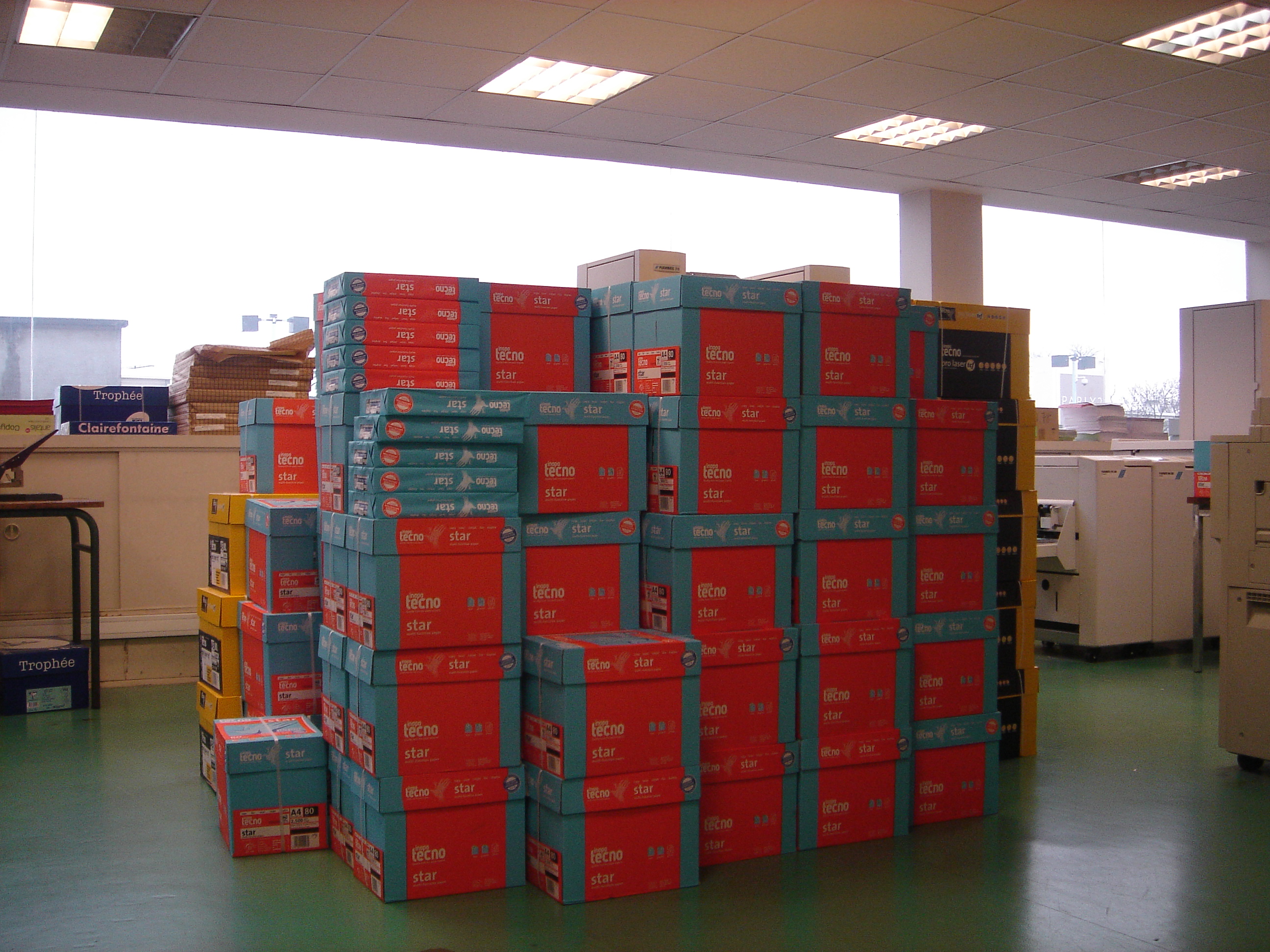 Avec mon collègue, nous avons appris à travailler en autodidacte sur ces différentes machines, car, jusqu’alors, nous n’en avions jamais manipulé de telles, si bien qu’au début, leur fonctionnement nous était complètement étranger. D’autre part, nos fonctions nous obligeaient à faire régulièrement l’inventaire des stocks disponibles et, selon nos besoins, il nous fallait veiller à renouveler les commandes de toutes les fournitures nécessaires au bon fonctionnement de l’atelier : papiers, agrafes, encres et rouleaux de masters (pour les duplicopieurs), etc. De cette façon, nous pouvions réceptionner jusqu’à plusieurs tonnes de papier en une livraison.
