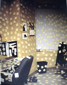 « Ces interventions furtives, sorte de dégâts volontaires ou dérèglement des habitudes, sont composées avec des substances issues de mon contexte de travail. Elles sont en quelque sorte des “ action-painting ” opérant une transgression des installations prévues pour le repos et les besoins essentiels au sein du lieu de travail[2]. »