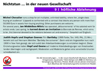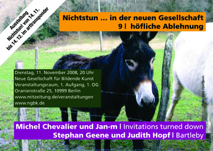 Conférence, « No to business-as-usual », NGBK (Nouvelle société pour les Arts Plastiques), Berlin, Allemagne, novembre 2008.