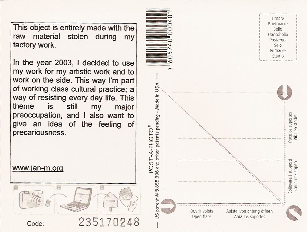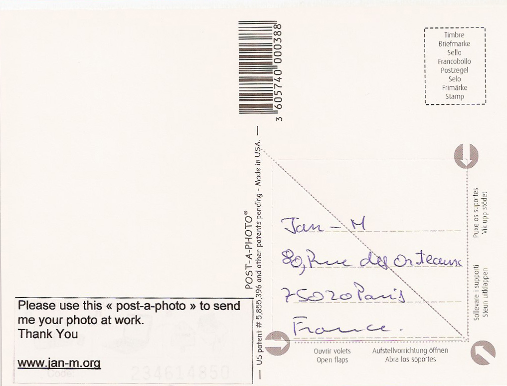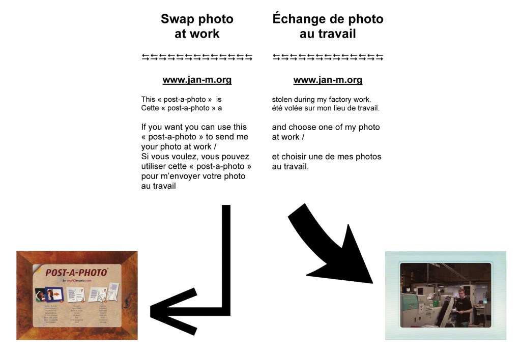 Ce dispositif prenait alors la forme d’une incitation au troc puisqu’en échange des photographies placées à leur disposition, les at-workers canadiens étaient invités à contribuer en prenant également une « post-a-photo » – une carte « vierge », mais déjà prérédigée à mon nom et à mon adresse postale de destination –, afin d’y insérer une photographie de leur autoportrait au travail puis de me l’expédier en retour.